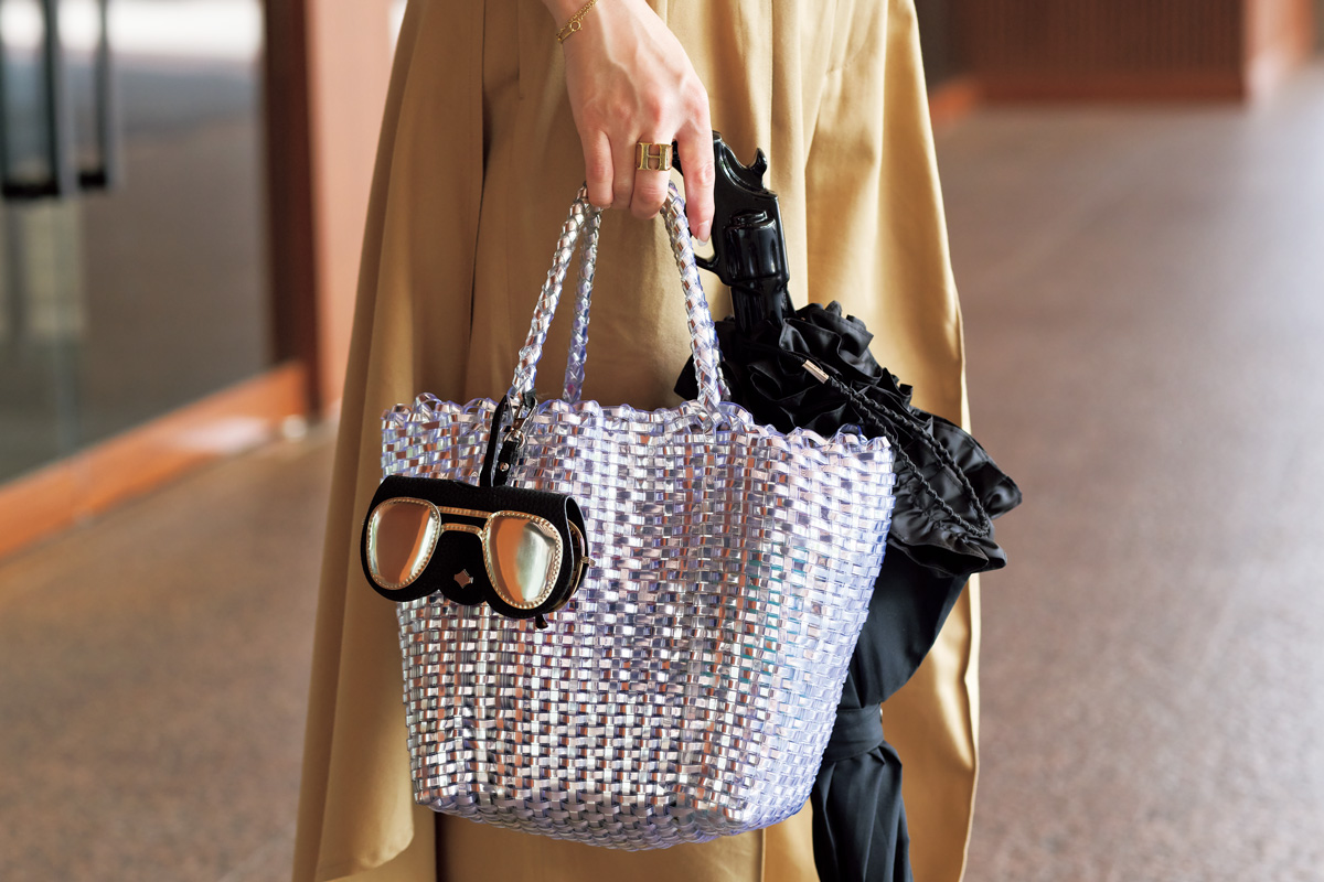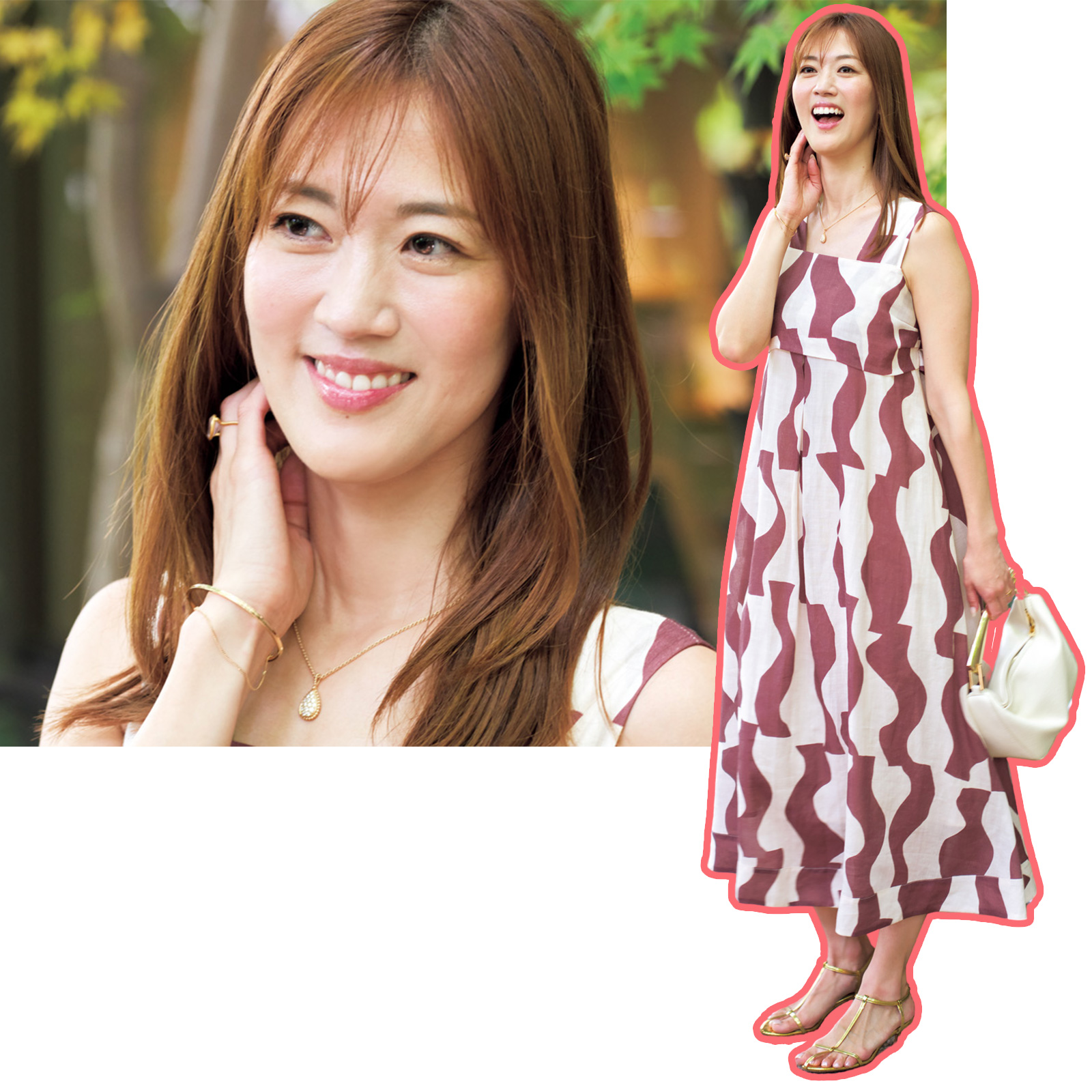 幾何学柄ワンピはemmiのもの。サンダルはLE TALON、胸元のジュエリーはブシュロン。お気に入りバッグは「ヘルシーコーデを引き立てる、ZARAの優秀なプチプラなんです」。HERAのクッションファンデはカバー力&ツヤが好み。Dior マキシマイザー 010で華やかさも。子どももOKな紫外線予防のさらさらUVスティックは、サッと塗りなおせて重宝している。