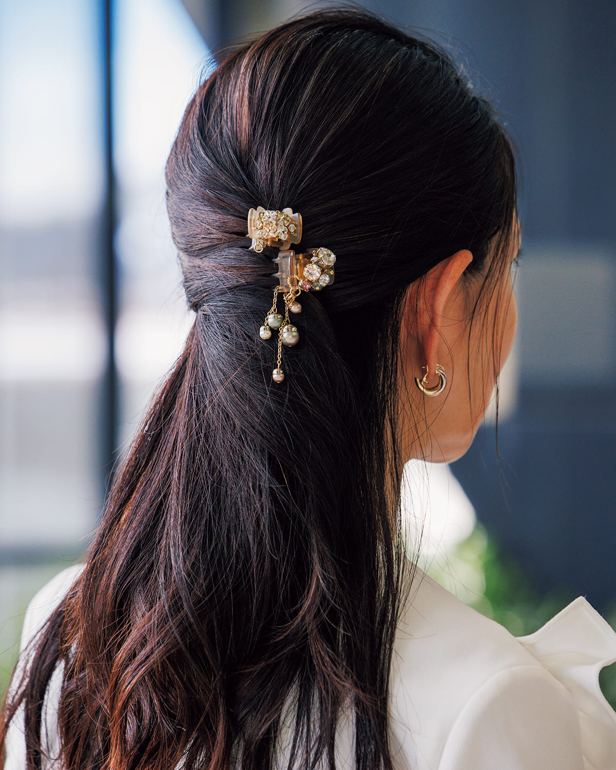 10年前から集めているコンプレックス・ビズのデザートクリップは、毛量が多い私の髪もしっかり留まり、簡単にヘアアレンジができるから◎。公園で子供たちと遊ぶときもヘアスタイルはエレガントに!