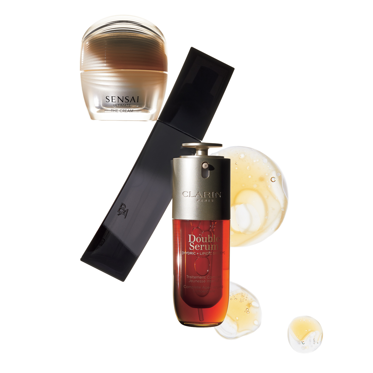 「この秋、第9世代へとリニューアル。使ってすぐにハリやキメ、ツヤ、なめらかさ、潤いを実感。夜使えば、疲れが溜まってしぼんでしまった肌も、翌朝にはふっくら。朝使えば、ファンデーションのノリがアップ。撮影現場でももう何年も使っていますが、このバランスのよさは唯一無二!」写真右・ダブルセーラムADC 50ml ¥17,380(クラランス)