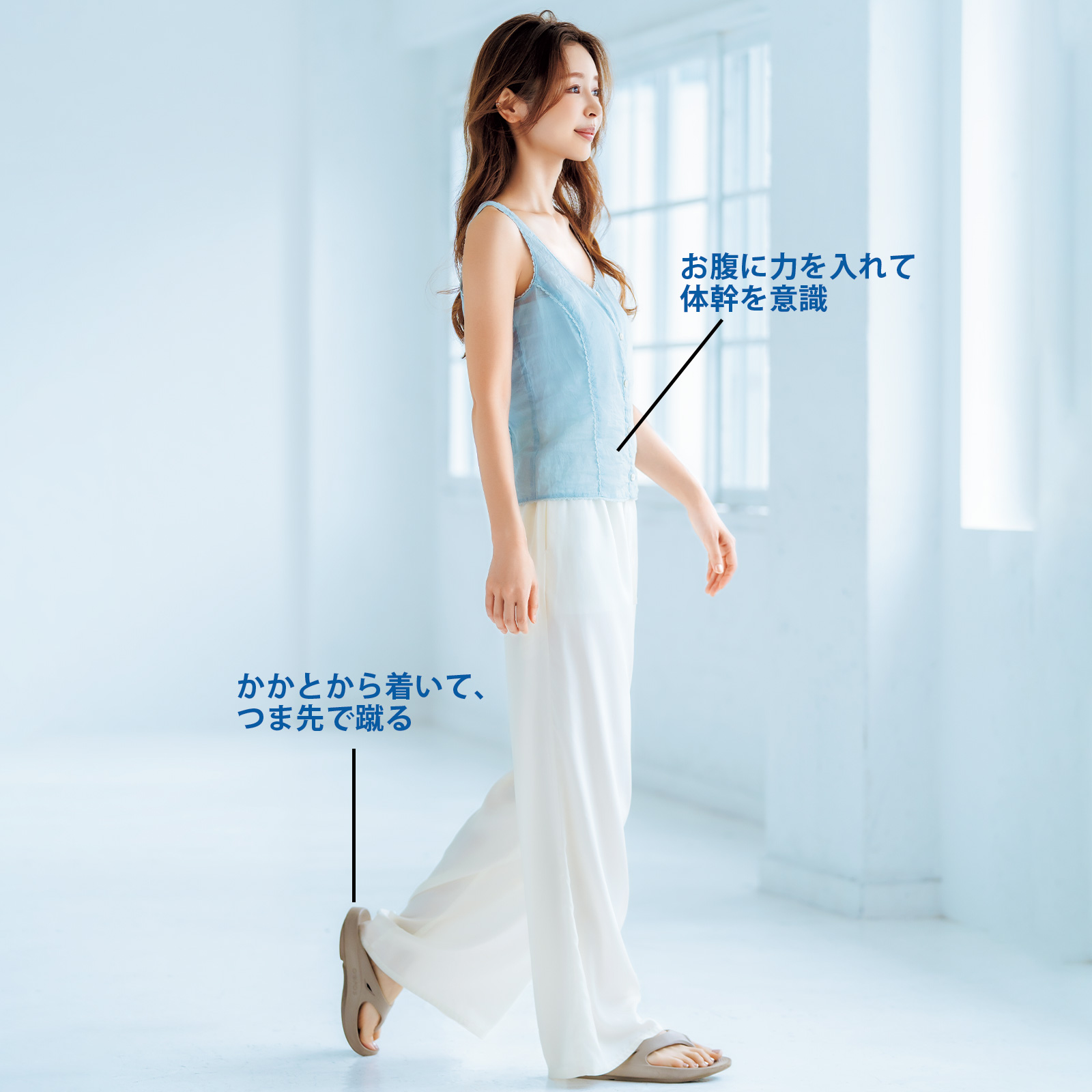 歩くときは体幹以外の力みを抜いて頭の重さを全身で支えることができるよう、まっすぐ前を向いて歩くのが◎。スマホ歩きは変なところに筋肉がつく原因に。かかとから着地してつま先で地面を蹴り、きちんと重心の移動をするとエクササイズ効果もアップします。