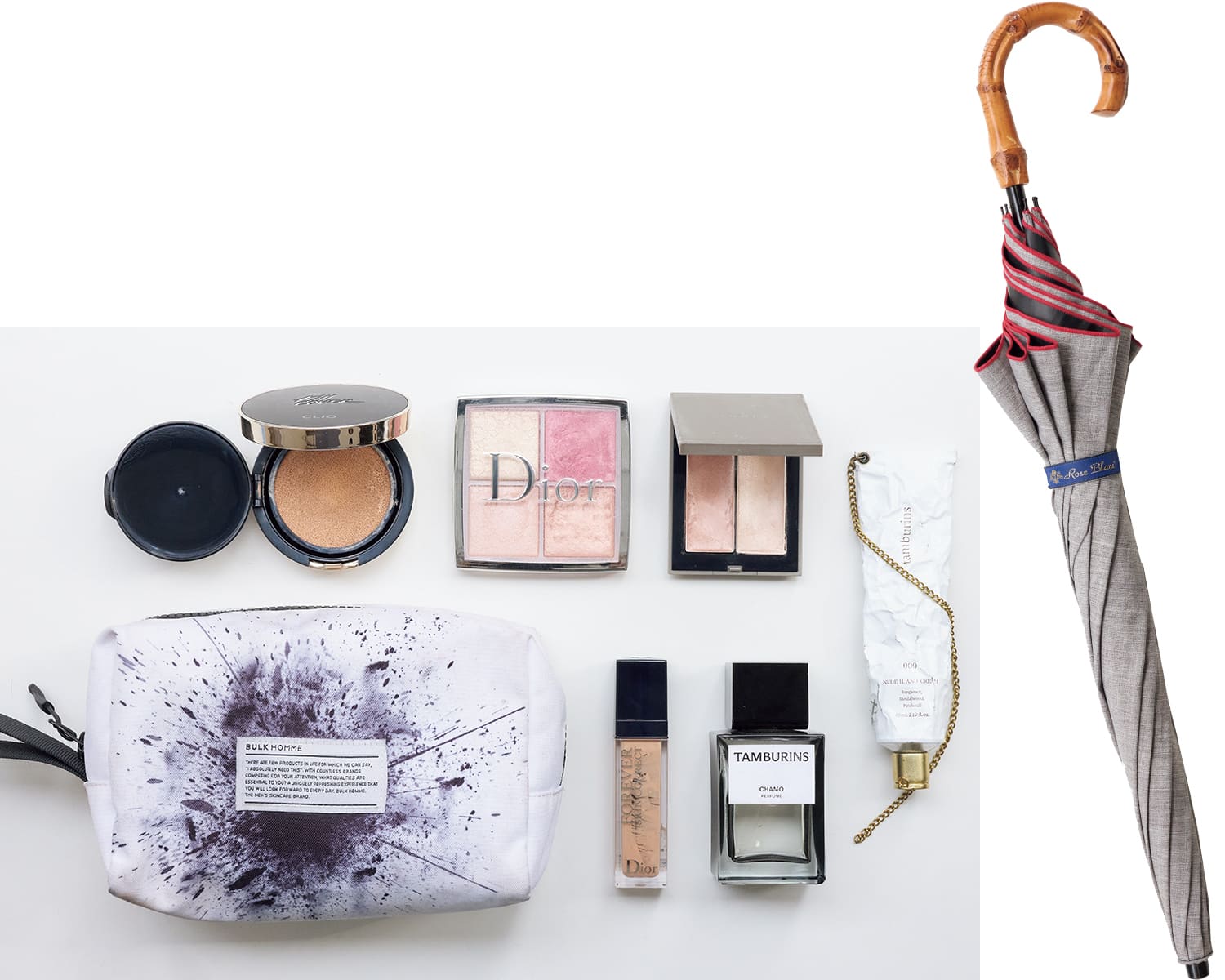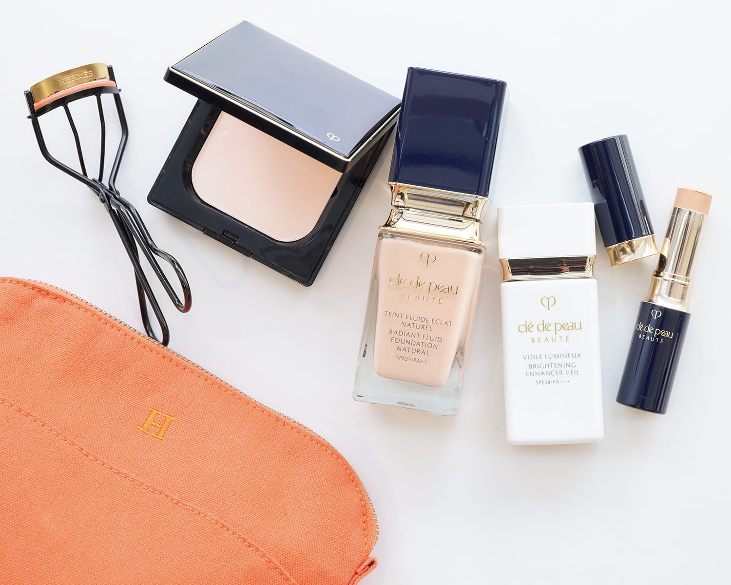 下地、リキッドファンデ、コンシーラー、フェイスパウダーすべてをクレポで統一して陶器肌に。自然にグンと上がるエルメスのビューラーは外出時も手放せません(安希子さん)。汗やヨレに圧倒的に強いCLIOキルカバークッションファンデ、THREEのシマリング グロー デュオ、Diorのコンシーラーで健康的な肌づくり。TAMBURINSのパフュームとハンドクリームで香り対策も。100%完全遮光、芦屋ロサブランの日傘も愛用しています(光さん)。