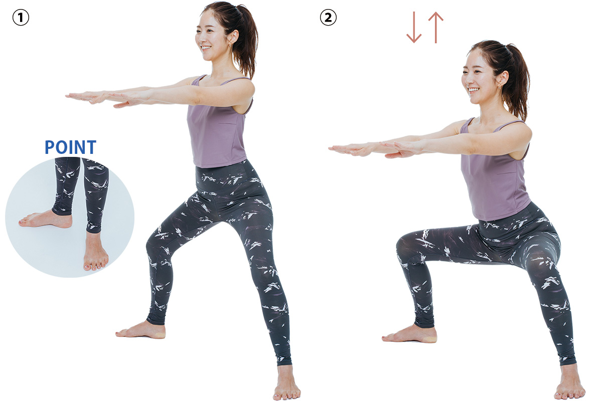 POINT▶︎つま先は90度の角度で開くのがポイント。膝を痛めないよう足の向きを揃えて。