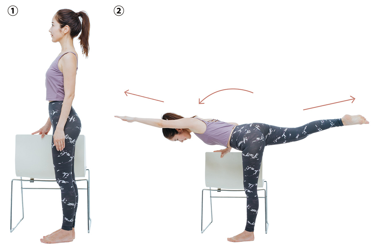 いすを補助に使います。右手でいすの背をつかみ、まっすぐ立ちます。4秒かけて左手と右脚を水平に伸ばし4秒かけて戻します。