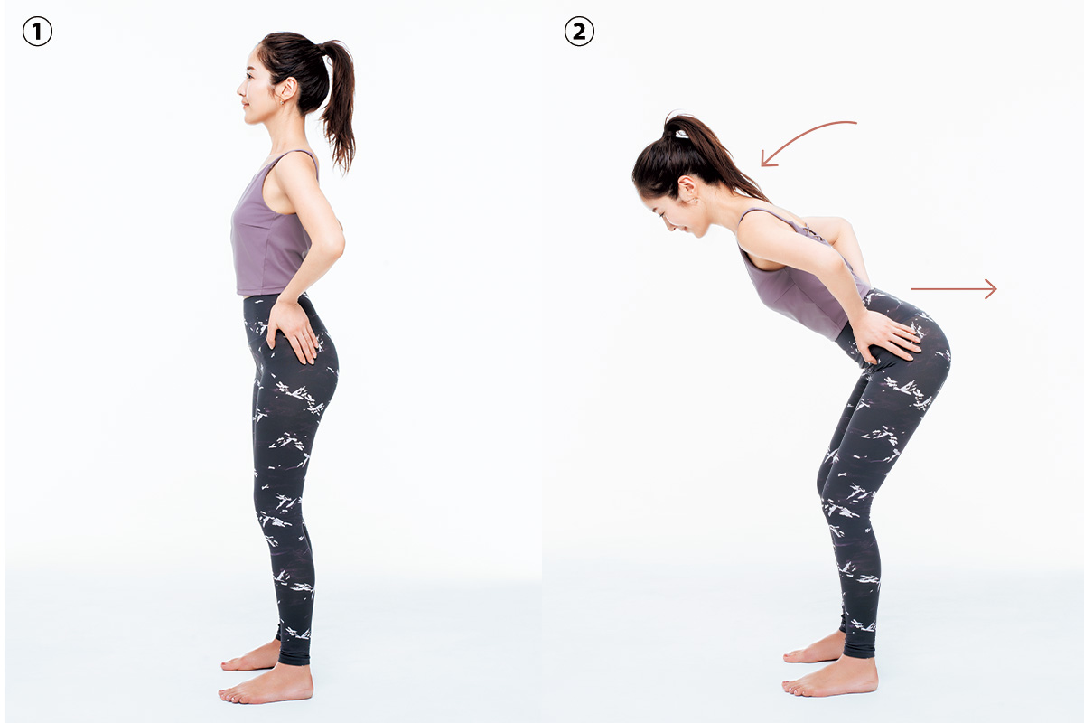 軽く膝を曲げ背中をまっすぐにして立ちます。そこから45度上半身を前に4秒かけて倒します。腰痛の人は無理のない範囲で。
