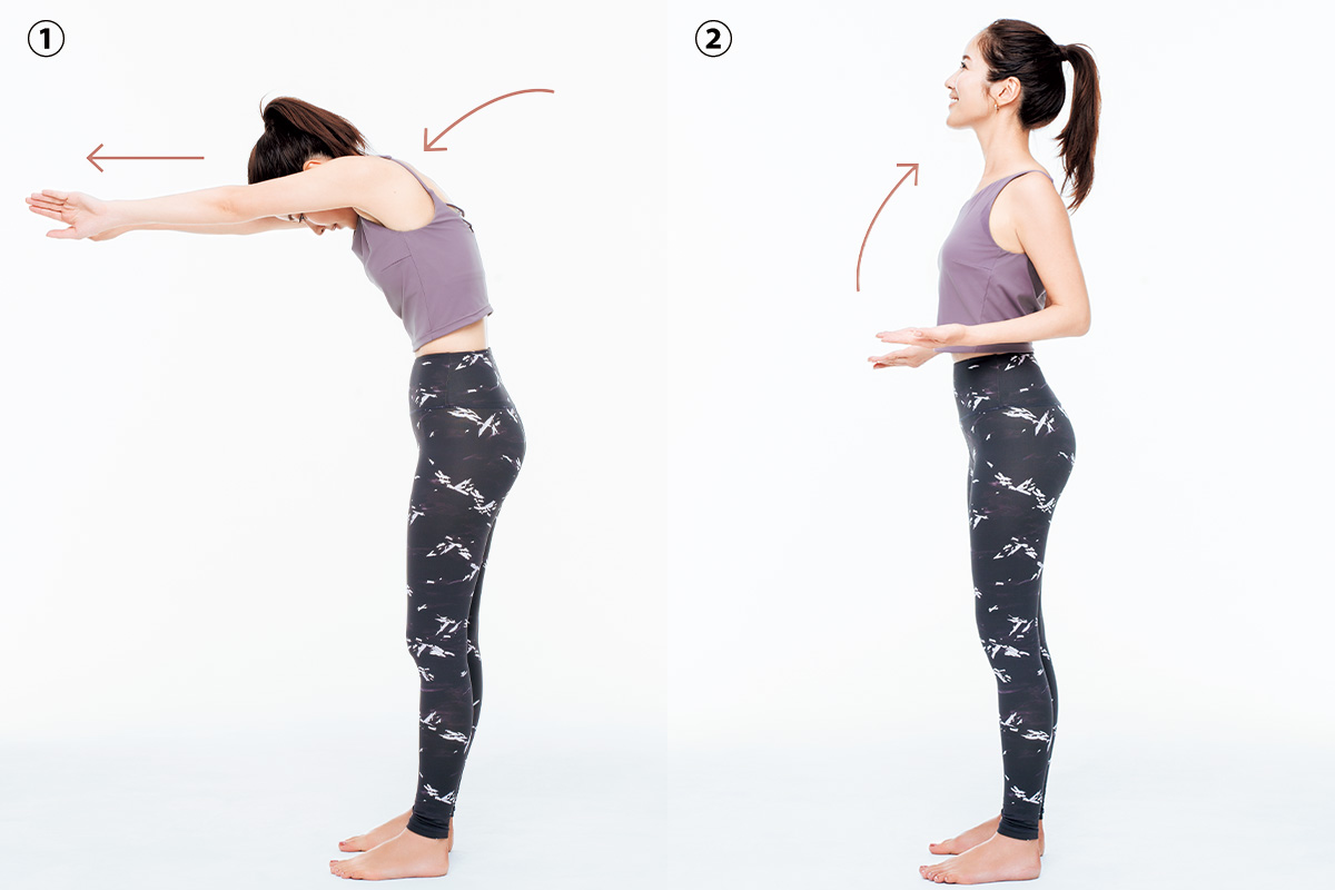 足を開いて立ち、息を吐きながら手の甲を合わせるように両腕を前方に伸ばし背骨を丸めて頭を下げます。