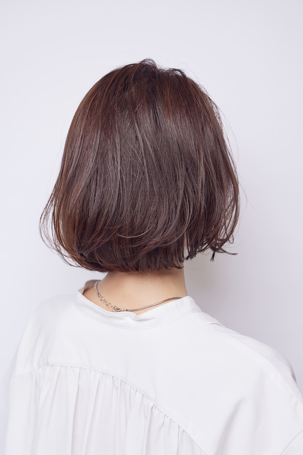 あご下でやや長めにするのがポイント。毛先に厚みを残して、内側の毛量をしっかりと取っていきます。横にふわっと広がるのに重くない仕上がりに。