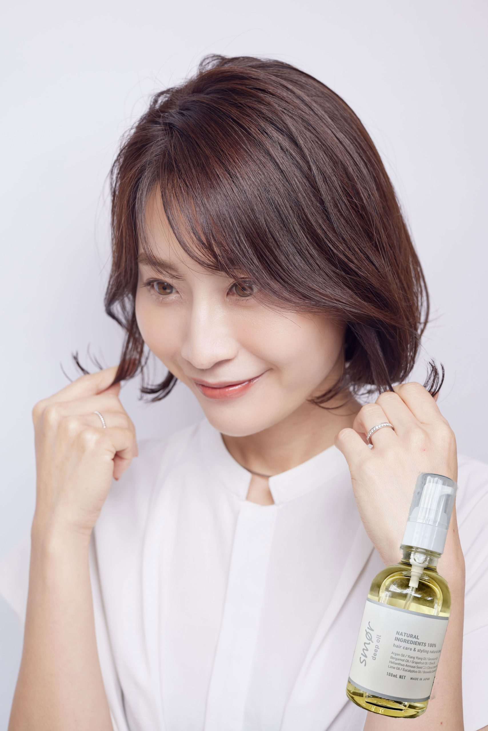 根元を立ち上げるようにドライヤーで乾かし、顔まわりはややリバースに動きをつけます。もみあげの毛束をハネさせると可愛い。質感が重めのオイルをなじませて完成。スメール ナチュラル ディープ オイル 100ml ¥3,300/NORA(https://nora0427.base.shop/)