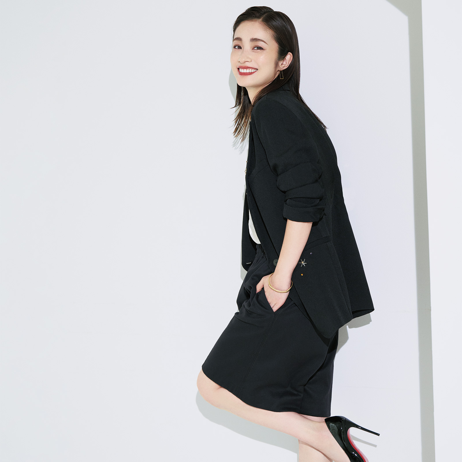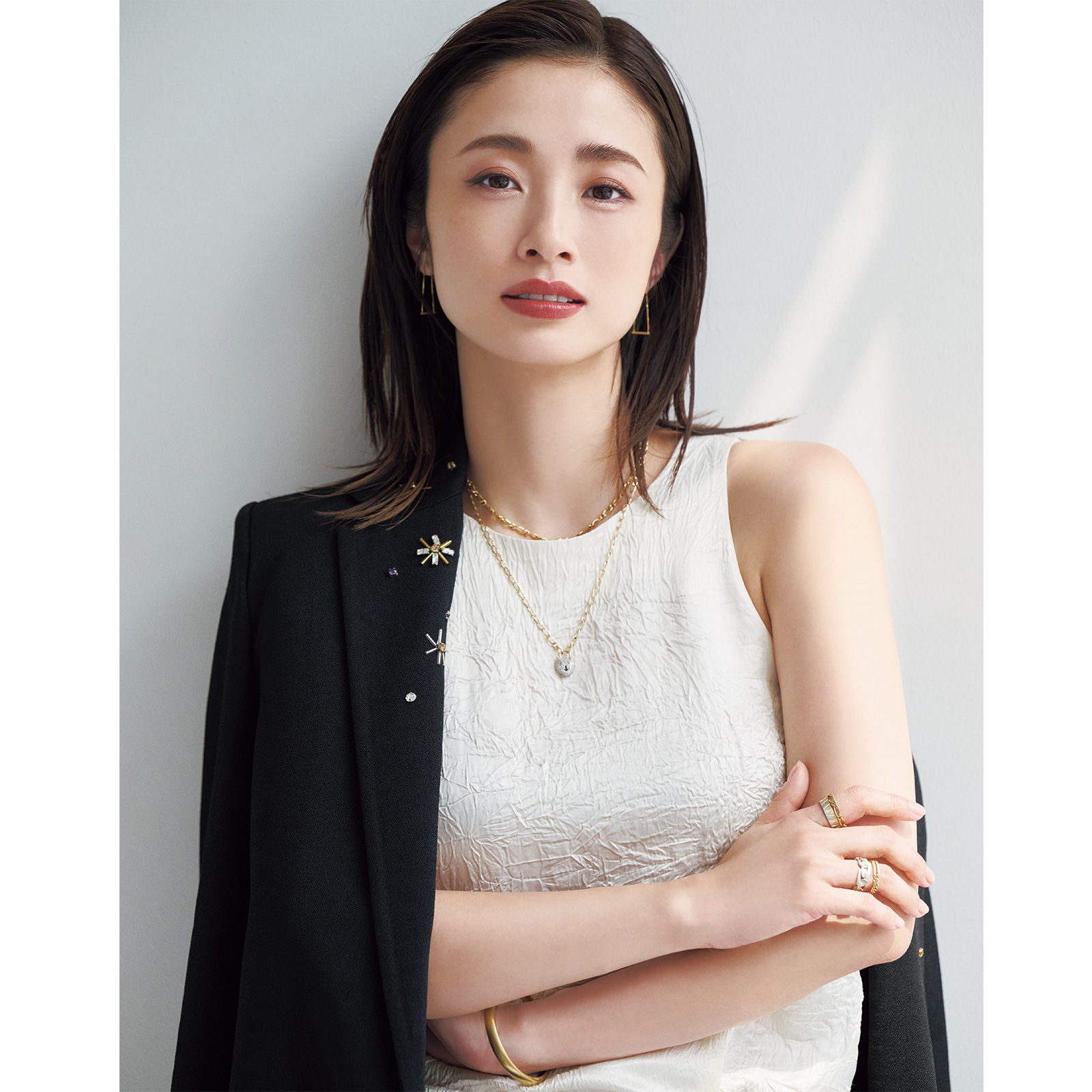 ジャケット¥187,000パンツ¥82,500(ともにフォルテ フォルテ/コロネット)トップス¥41,800(サヤカ デイヴィス/ショールーム セッション)ピアス¥99,000 右手人差し指リング(付け根)¥418,000右手薬指リング(付け根)¥49,500(すべてトーカティブ/トーカティブ 表参道)ネックレス(上)¥735,900バングル¥1,536,700右手人差し指リング(指先)¥126,500右手薬指リング(指先)¥172,200(すべてキウナ/エスケーパーズ アナザーワールド)ネックレス(下)(ペンダントとチェーンのセット)¥352,000(マリア ブラック/マリア ブラック 表参道店)パンプス¥125,400(クリスチャン ルブタン/クリスチャン ルブタン ジャパン)