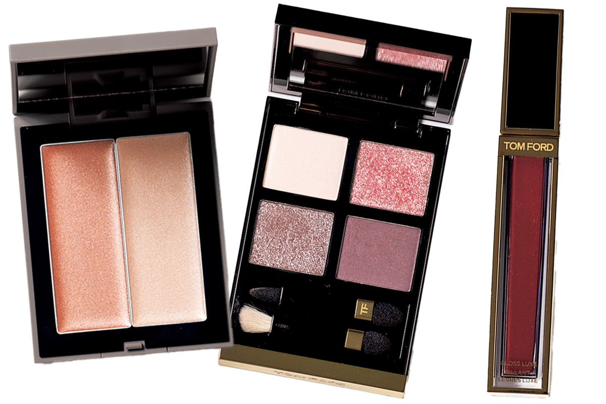 ベースは日焼け止めのみの日が多いので、カラーものは素肌を引き立てる色みを。トム フォードのグロス20は濃厚なブラウンとツヤが上品で、アイシャドウ 4A は見たままの鮮やかな発色。さらにクリーミーなTHREEのチーク&ハイライトで、顔に立体感をプラス。