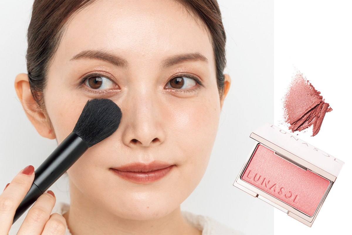 いつもより高めに血色感を入れると主役のアイメイクと好バランス。高め、内側寄りにブラシを置き頰骨に向かって横長に色をのせて。