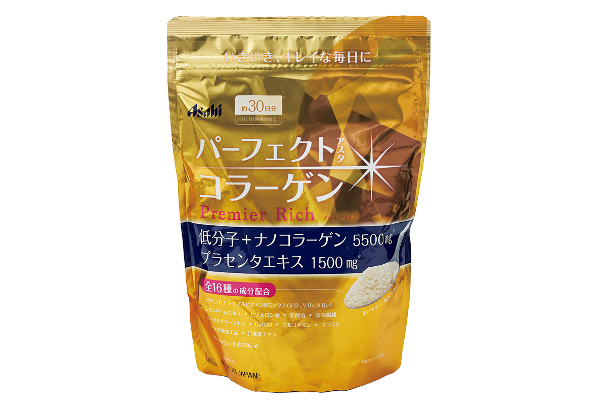 低分子+ナノコラーゲンを1回分5,500mgはじめプラセンタやレモンバームエキスなど全16種類の美容成分配合。228g¥3,380(アサヒグループ食品)