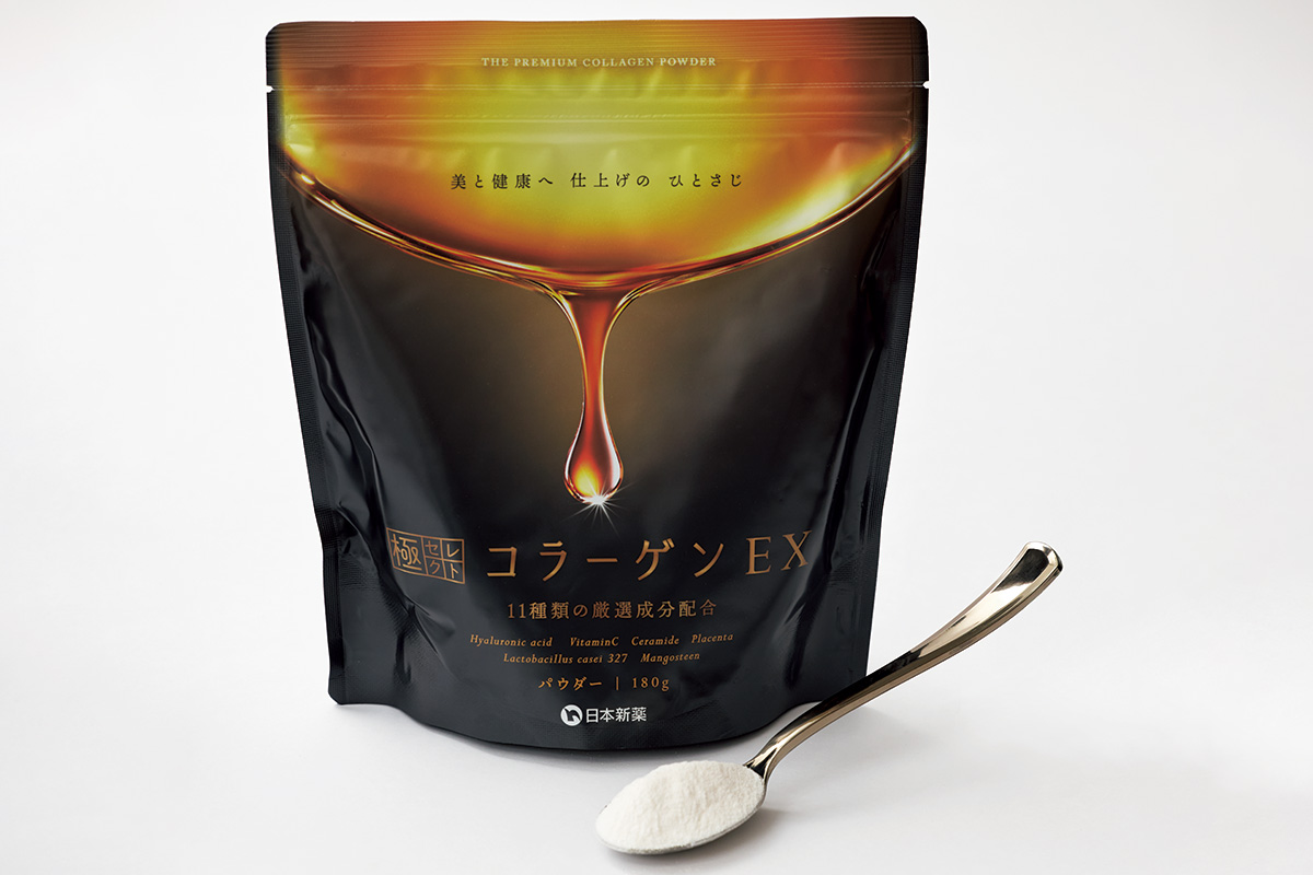 高純度、高品質の低分子フィッシュコラーゲンを配合。無味無臭で飲みやすいのも嬉しいポイント。180g ¥2,980(日本新薬)
