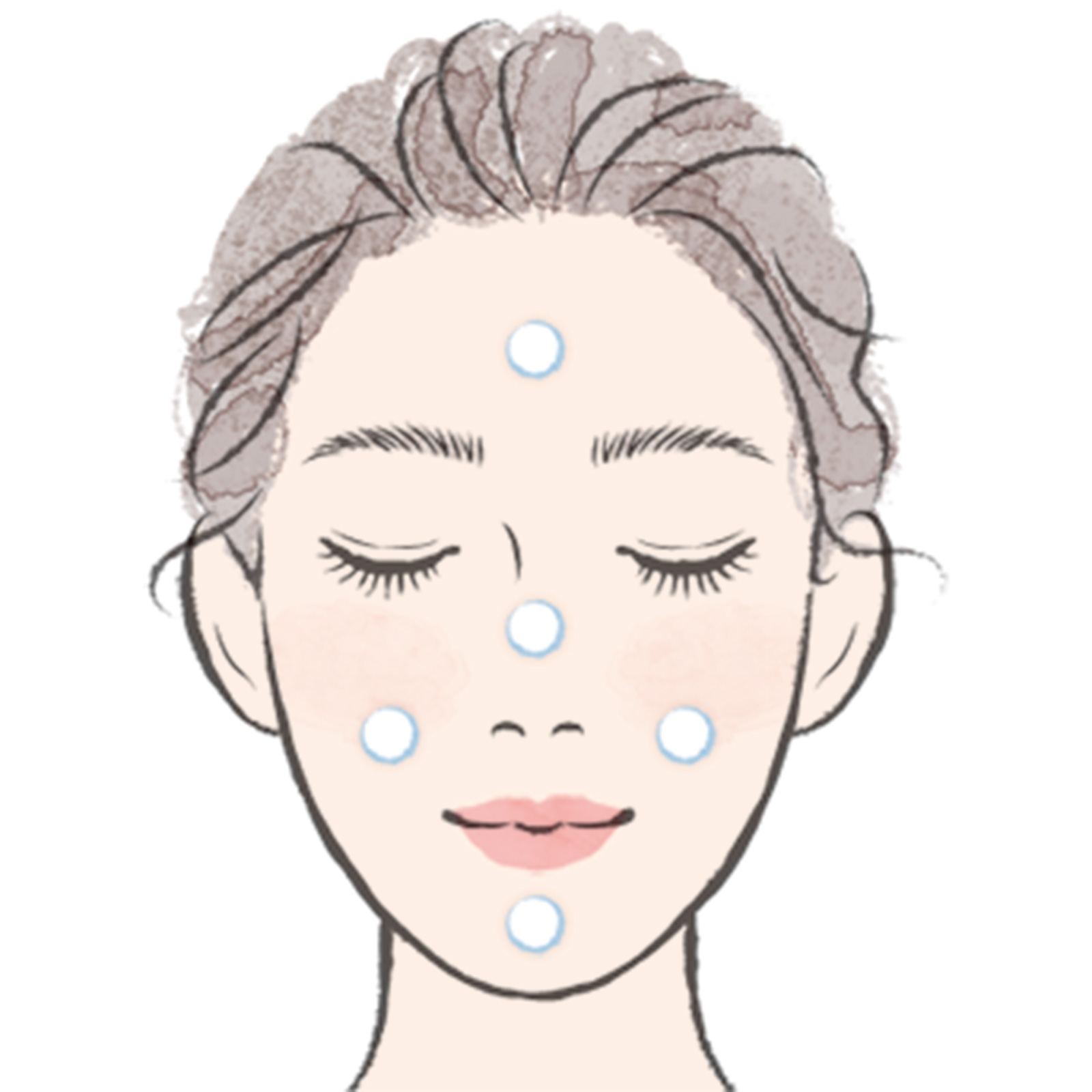 ディスペンサー2回押した分を取り、セラムを顔の5カ所において内側から外側へと馴染ませる。