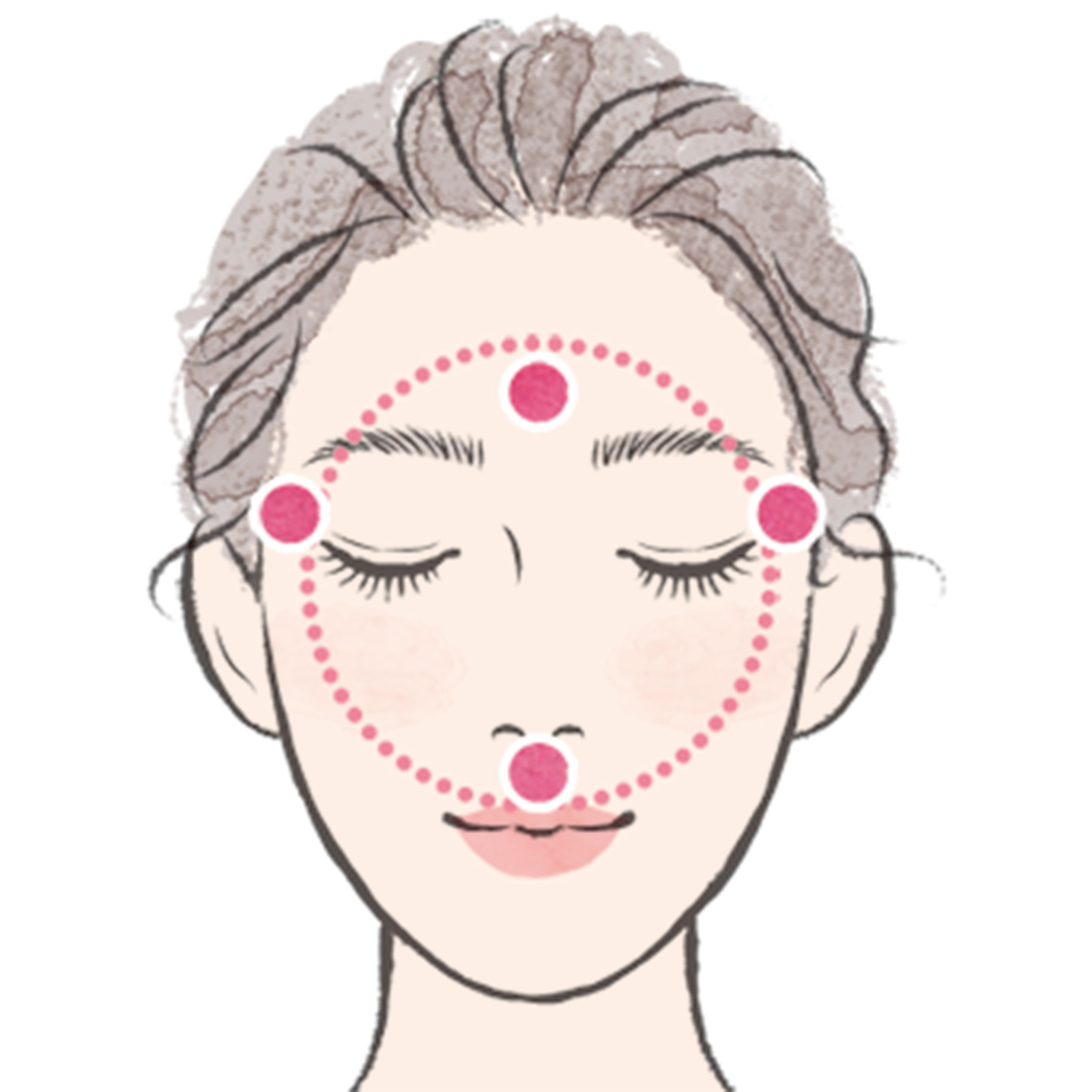 緊張を緩めるステップ。クリームを顔に馴染ませてから、両手の人差し指を重ね、人中(上唇のツボ)に置き、3秒キープし、そのままこめかみまで滑らせ、人差し指と中指でこめかみを3秒押さえる。眉の上を眉間まですべらせ同じく3秒押さえる。