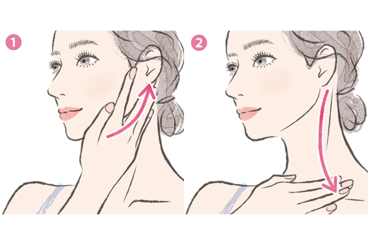 クリームを顔全体に馴染ませて、人差し指の側面をあて頰を持ち上げるように滑らせる(3回)。①人差し指と中指でフェイスラインを挟むようにして顎から耳までさすり上げ、②四指を首の横から鎖骨に向かって滑らせる(3回×左右)。