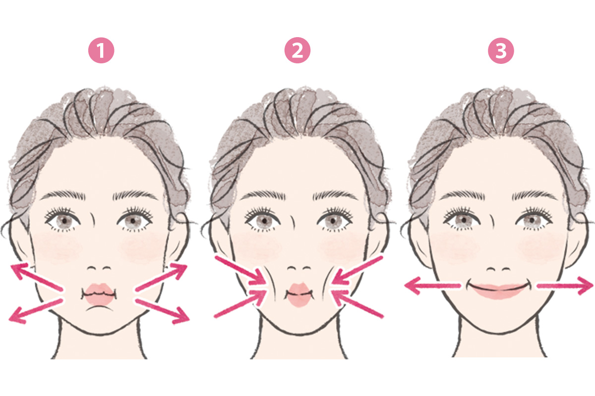 クリームを馴染ませた後、フェイスマッスルプログラムで表情筋を鍛えるエクササイズを。3つのうちの一つを紹介。頰を膨らませて10秒キープ、次に頰を強く吸い込んで10秒キープ。最後に口角を強く横にひいて10秒キープ。