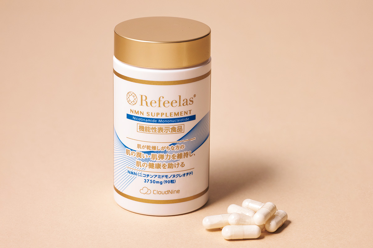「肌のうるおいや弾力を維持してくれるNMN配合のサプリメント。有機大豆と善玉菌を発酵させた大豆発酵物も配合していることから、これを飲んでいると腸の調子がいいです。そして元気になるので続けています」90粒¥16,200(Cloud Nine)