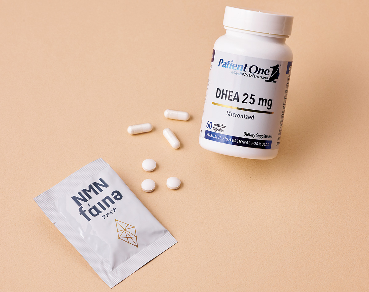 「長寿ホルモンとして知られるDHEAと抗老化のためのNMNを約4年前から愛飲しています」左:180粒¥32,400(三菱商事ライフサイエンス)、右:60粒¥5,800(Patient One/神宮外苑 Woman Life Clinic)