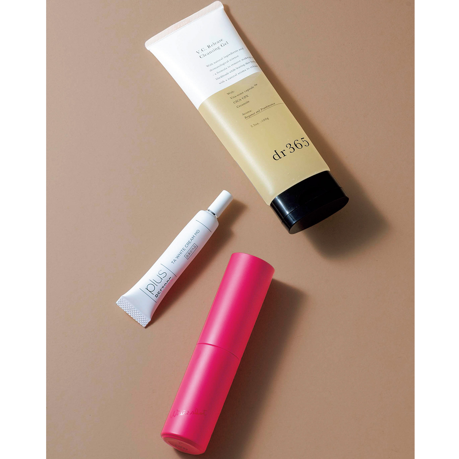 「肌のザラつきを解消してから美白」上から、dr365 V.C. リリースクレンジングジェル 100g ¥3,520(dr365)プラスリストア TA ホワイトクリーム MD ¥2,750(本人私物)ホワイトショット フェイシャルセラム[医薬部外品]25ml ¥16,500(ポーラ)