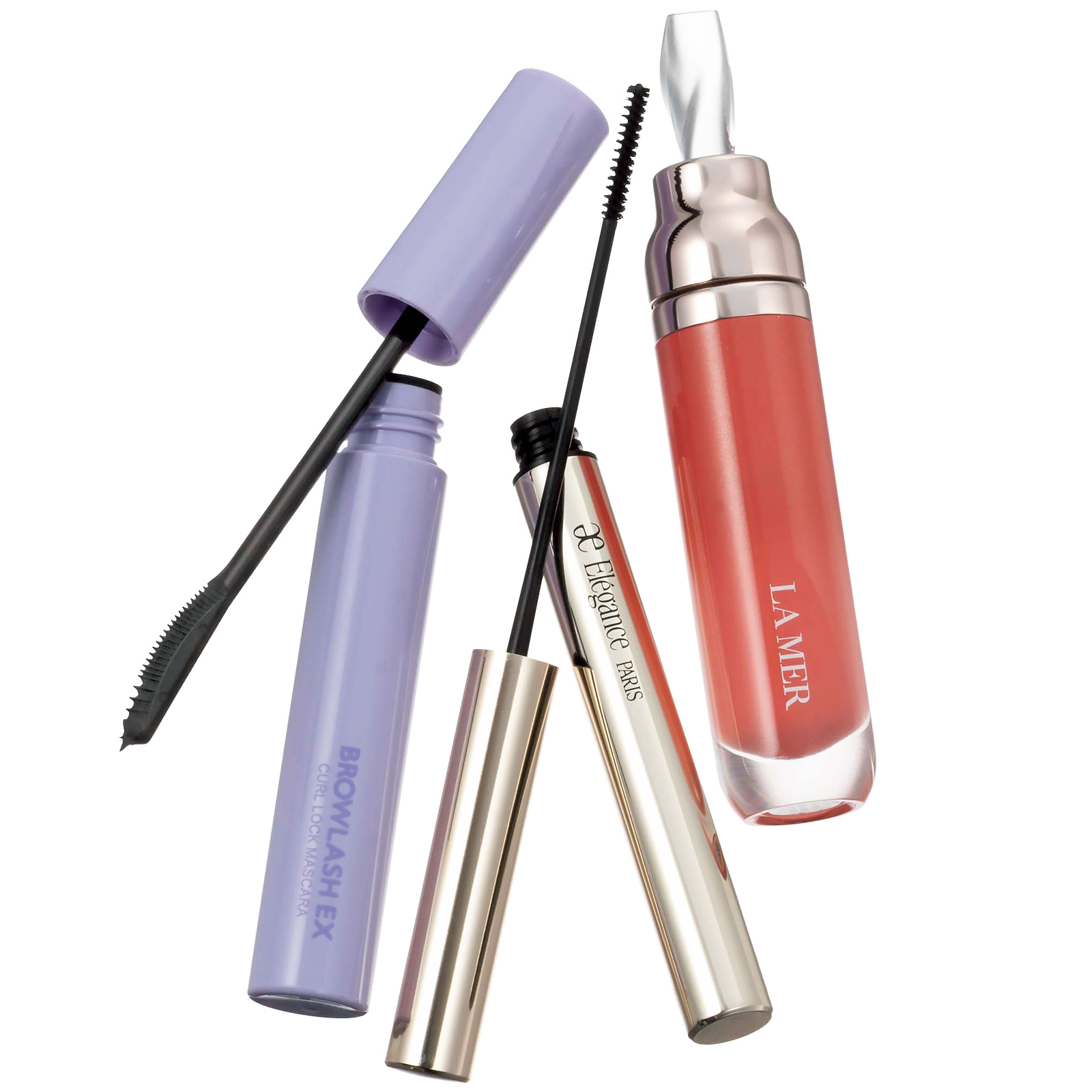 「ヘルシーな口元、目元を演出」左から、ブロウラッシュ 美束カールマスカラ シアーブラック ¥1,540(BCL)エレガンス カールアメイジング マスカラ BK10 ¥4,400(エレガンス コスメティックス)ラ・メール ザ・リップ ボリューマイザー¥9,900(ラ・メール)