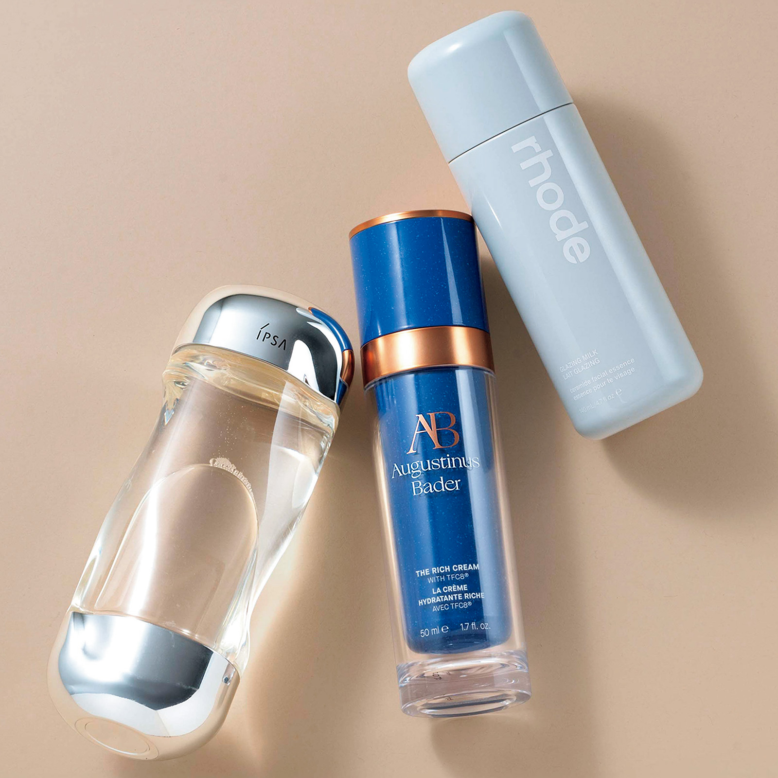 「海外で買ったブースターと乳液、久々に試して使用感が気に入ったイプサ、全部さっぱり系の使用感がお気に入り」左から、イプサ ザ・タイム R アクア[医薬部外品]200ml ¥4,730(イプサ)Augustinus Bader THE RICH CREAM、rhode GLAZING MILK LAIT GLAZING(ともに本人私物)