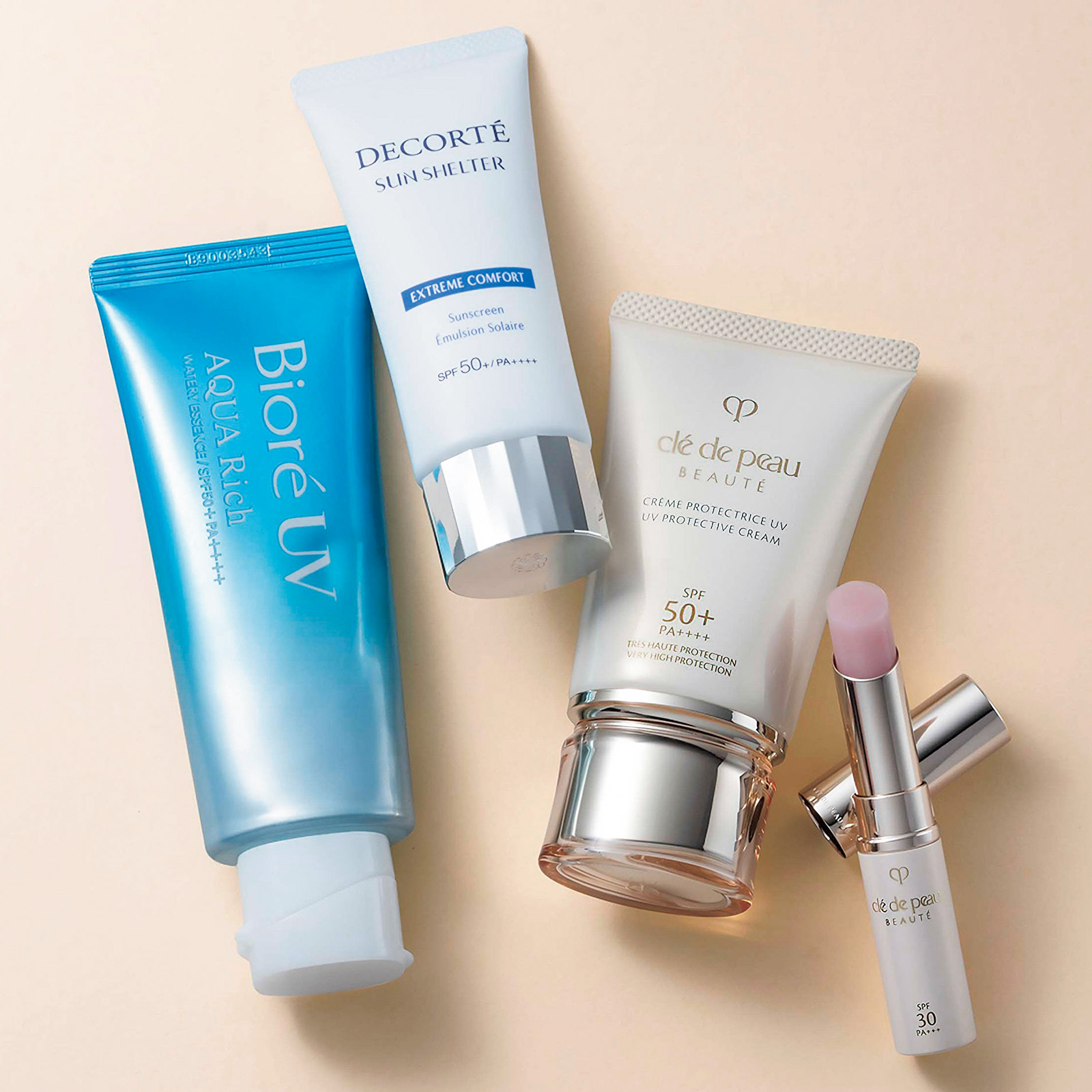 左から、ビオレ UV アクアリッチ ウォータリーエッセンス SPF50+/PA++++ 50g オープン価格(花王)コスメデコルテ サンシェルター マルチ プロテクション コンフォート SPF50+/PA++++ 35g ¥3,300(コスメデコルテ)クレ・ド・ポー ボーテ クレーム UV n 50g¥11,000 クレ・ド・ポー ボーテ ソワンプロテクトゥールレーブル SPF30/PA++++ ¥6,600(ともにクレ・ド・ポー ボーテ)