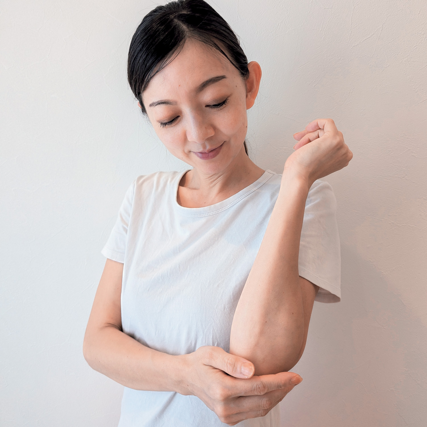 化粧水の後、顔全体にたっぷりと使用します。手のひらで顔全体を包み込むようにして浸透させたら、くすみやすい顔やデコルテ、贅沢ですが肘にもつけます。