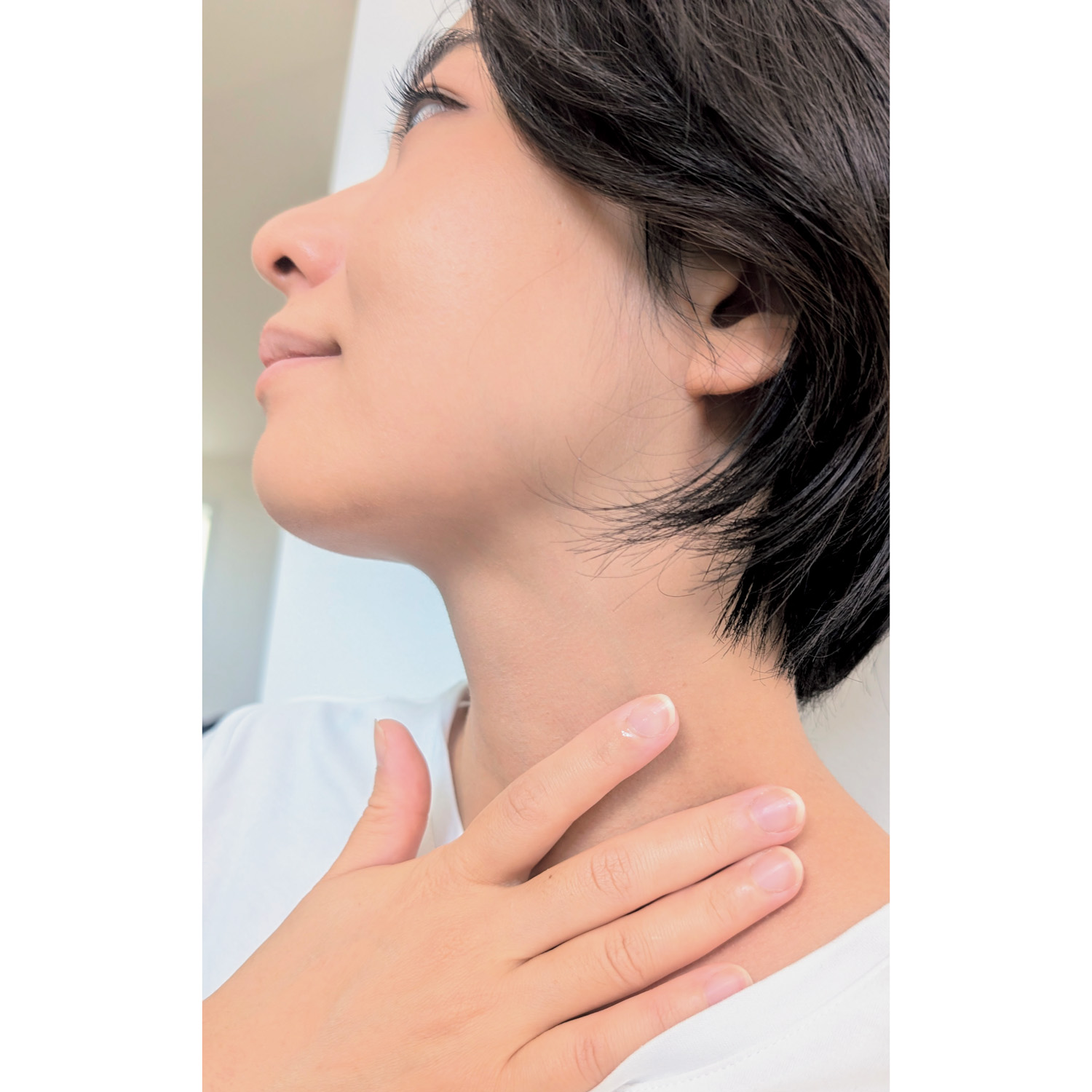 みずみずしいテクスチャーが炎症を起こした肌に寄り添います。顔だけなら2〜3プッシュですが、さらに1プッシュ足して、首まで塗布。より明るい肌印象に。