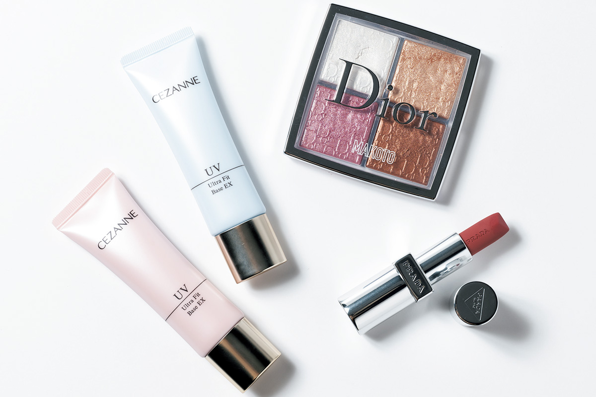 プチプラコスメも好きだけど、最新デパコスも必ずチェックしています。セザンヌの下地は肌作りにマスト。ハイライトやチークとして使い勝手がいい Dior のグロウパレットは001を愛用。プラダのリップは B101 が自然な血色感でお気に入りです。