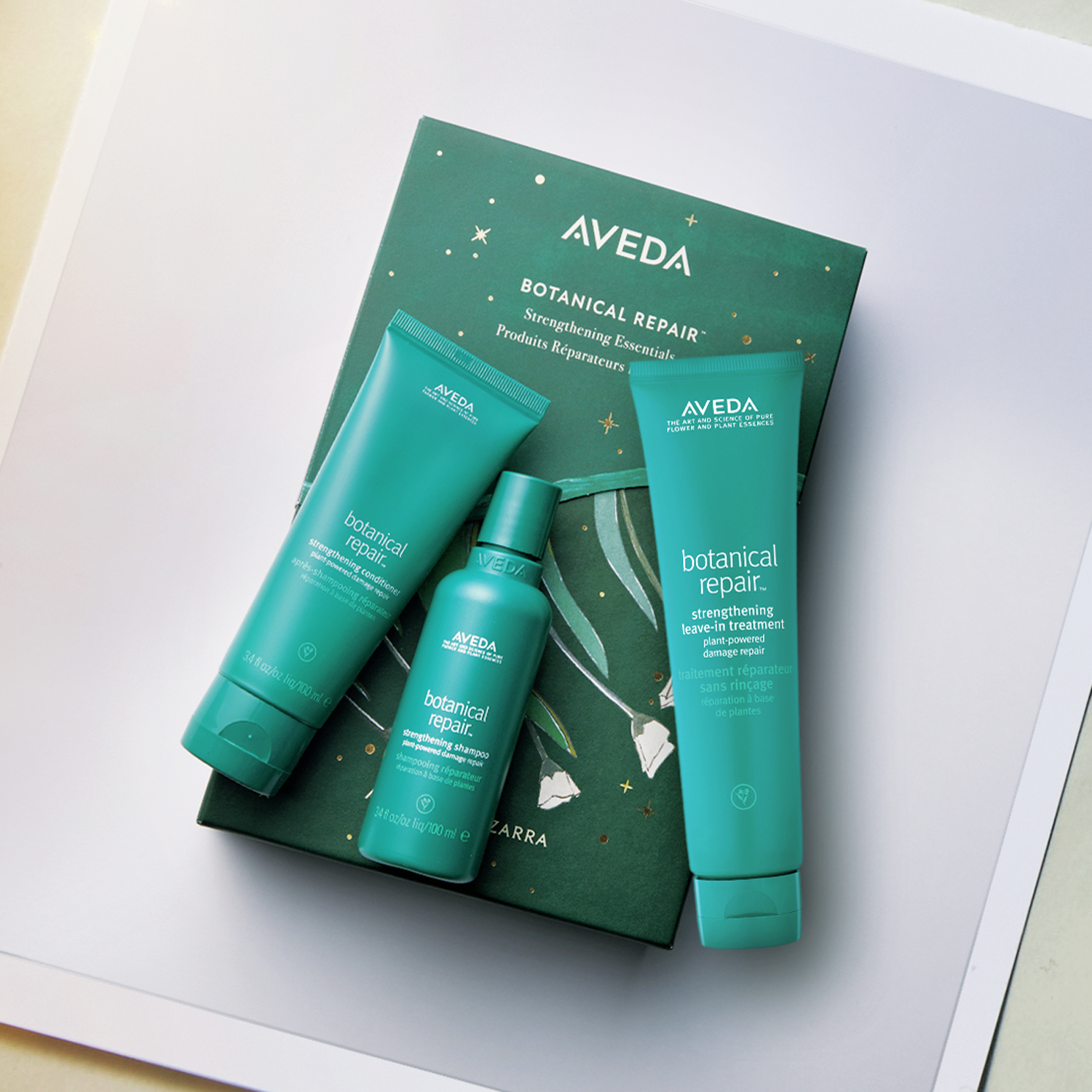 「ボタニカル リペア」シリーズのシャンプー、コンディショナー、洗い流さないトリートメントの3品がセット。~Altuzarra コラボレーション~ ボタニカル リペア ストレングスエッセンシャル ギフト ¥8,250(アヴェダ)