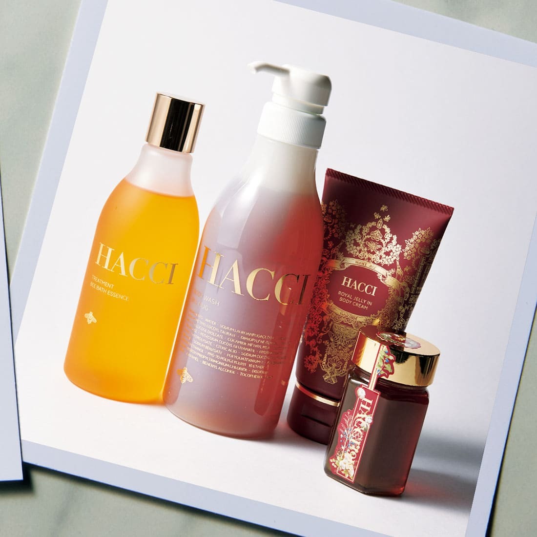ボディウォッシュやボディクリームに加え、ブランド初のバスエッセンス、もみの木のテーブルハニーと、外からも内からもはちみつのパワーを堪能。冷えた体と心をじっくりほぐします。ハニー ノエル ¥18,150(HACCI)
