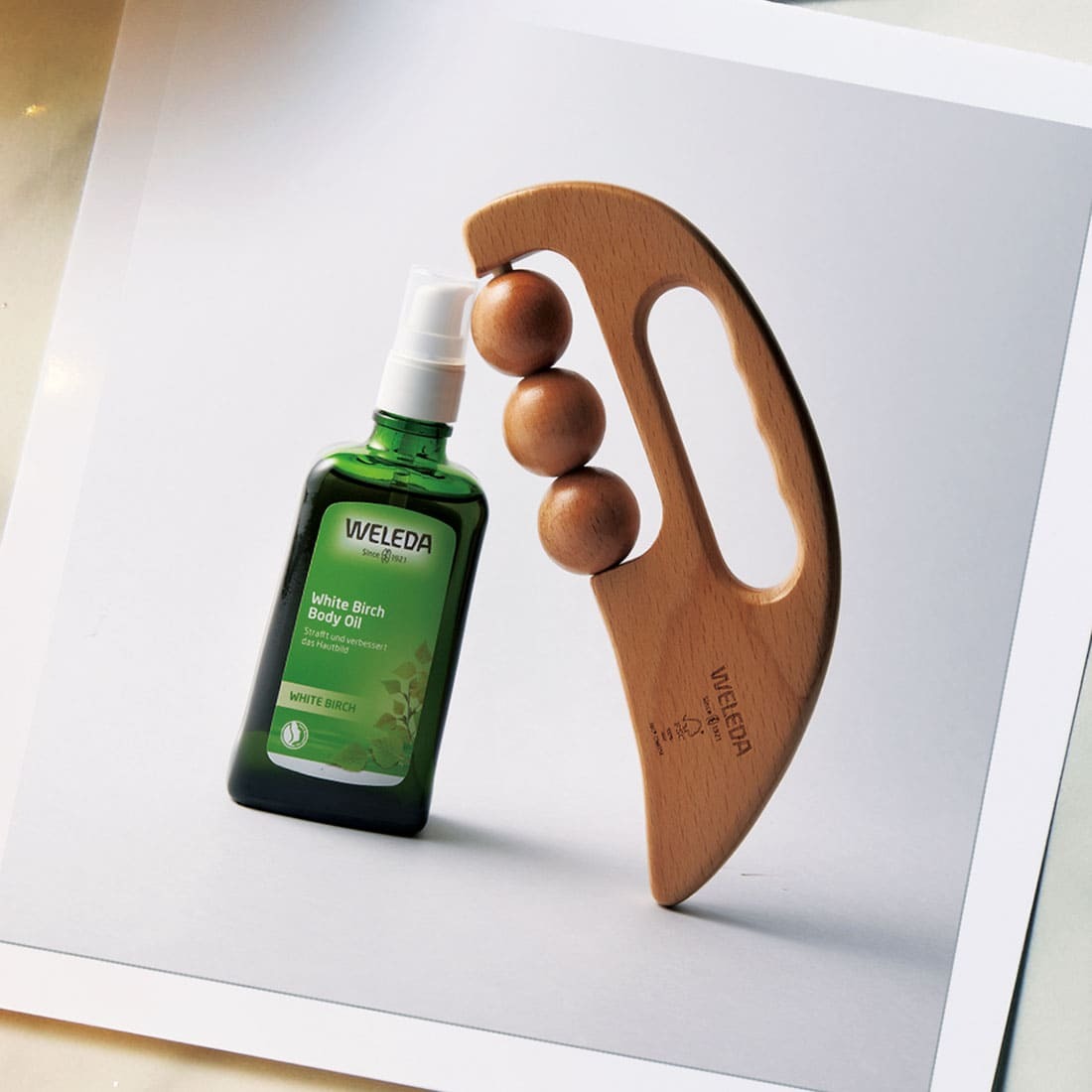 豊かな精油の香りで太ももや二の腕など、気になるパーツにアプローチする名品ボディオイルが現品で。さらにオリジナルの木製カッサと併せて、1年のコリをじっくりほぐして。ホワイトバーチ ボディオイルギフト ¥ 5,940(ヴェレダ)