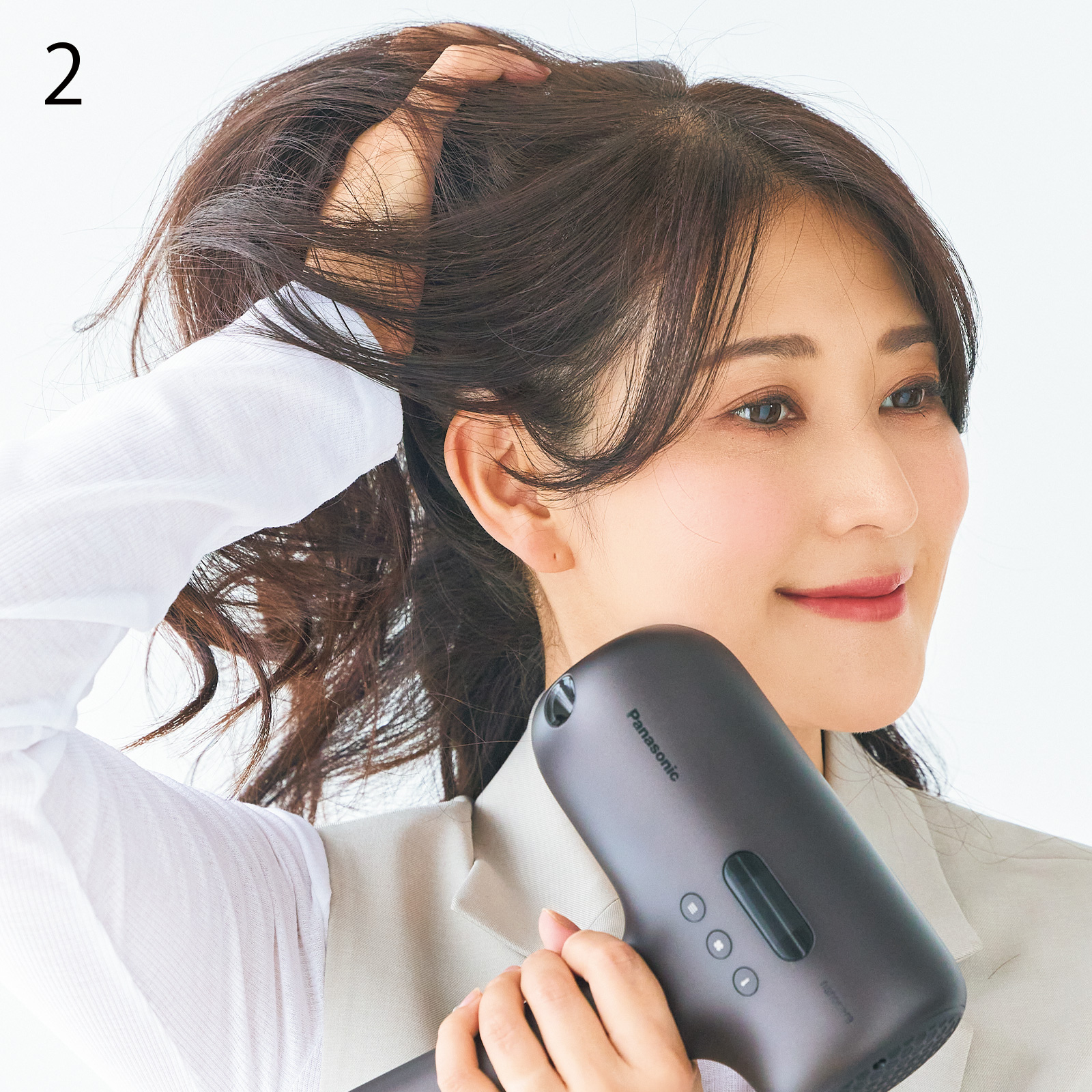 根元が立ち上がってふんわりするように、手ぐしを下から上に向けて通しながらドライヤーの風を下から当てて空気を含むようにドライ。