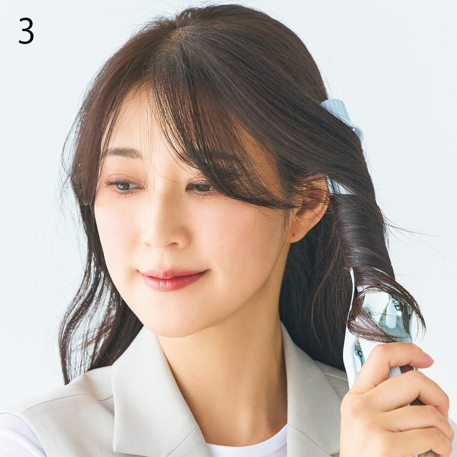 細めのカールアイロンを縦に使って全体を巻きます。顔周りを一束取ったらリバース、フォワードを繰り返してミックス巻きにします。