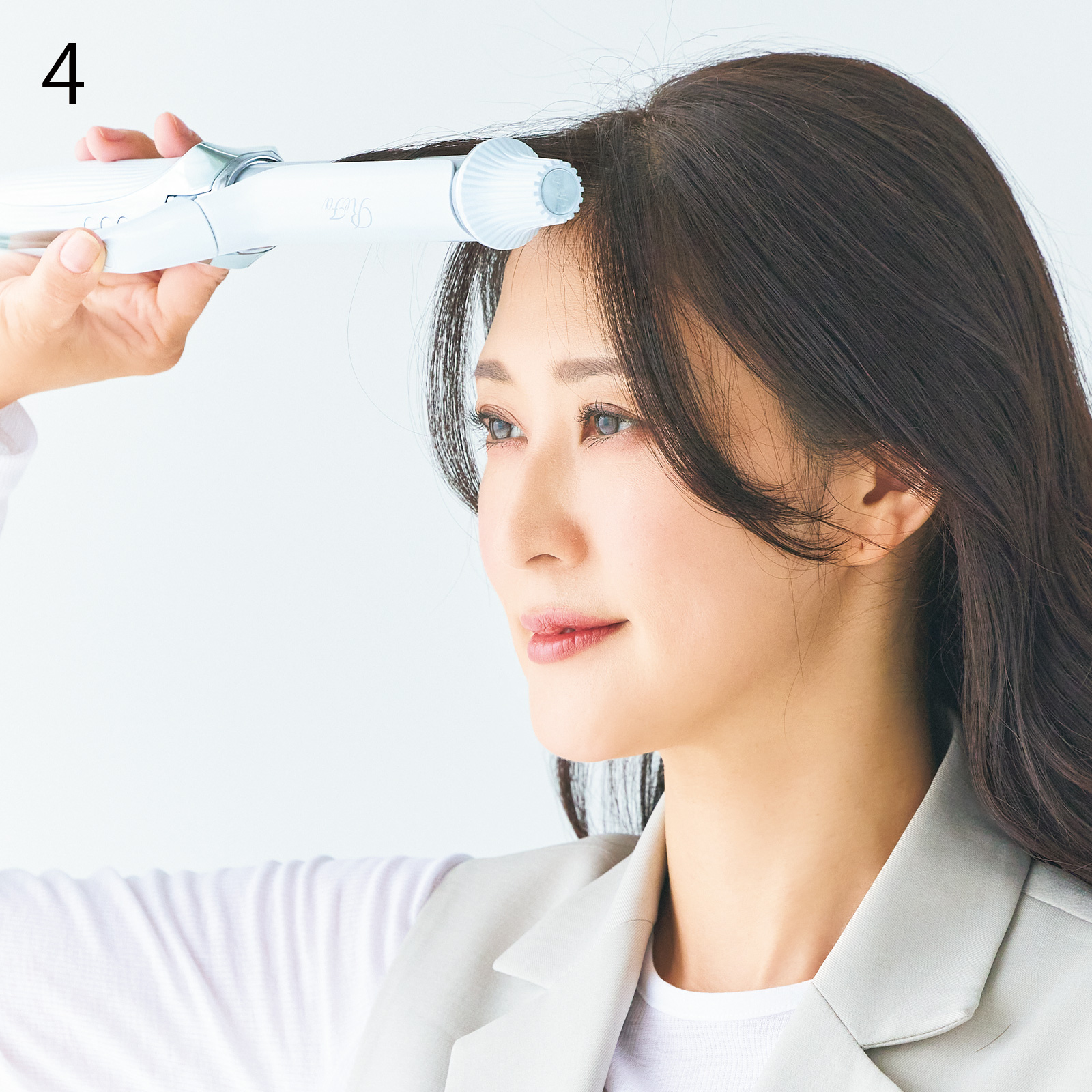 顔周りも根元が立ち上がるように巻きます。まずは前髪を大きなカールに巻き、サイドバングは毛先が後ろに流れるように整えて。