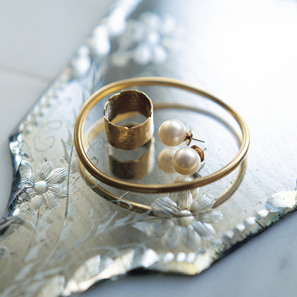 ハウス オブ ロータスのアンティークフェア用に買いつけたヴィンテージの手鏡は、パウダールームの洗面台が定位置。外した指輪やピアスを置くと、キラキラして癒されます。