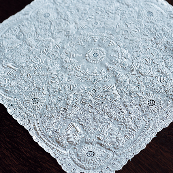 高校生の頃、母と初めて訪れた中国・上海のお土産もの屋さんで出合ったスワトウ刺繍のハンカチ。びっちりと刺繍された繊細な美しさに感激して以来、大切なときに使います。