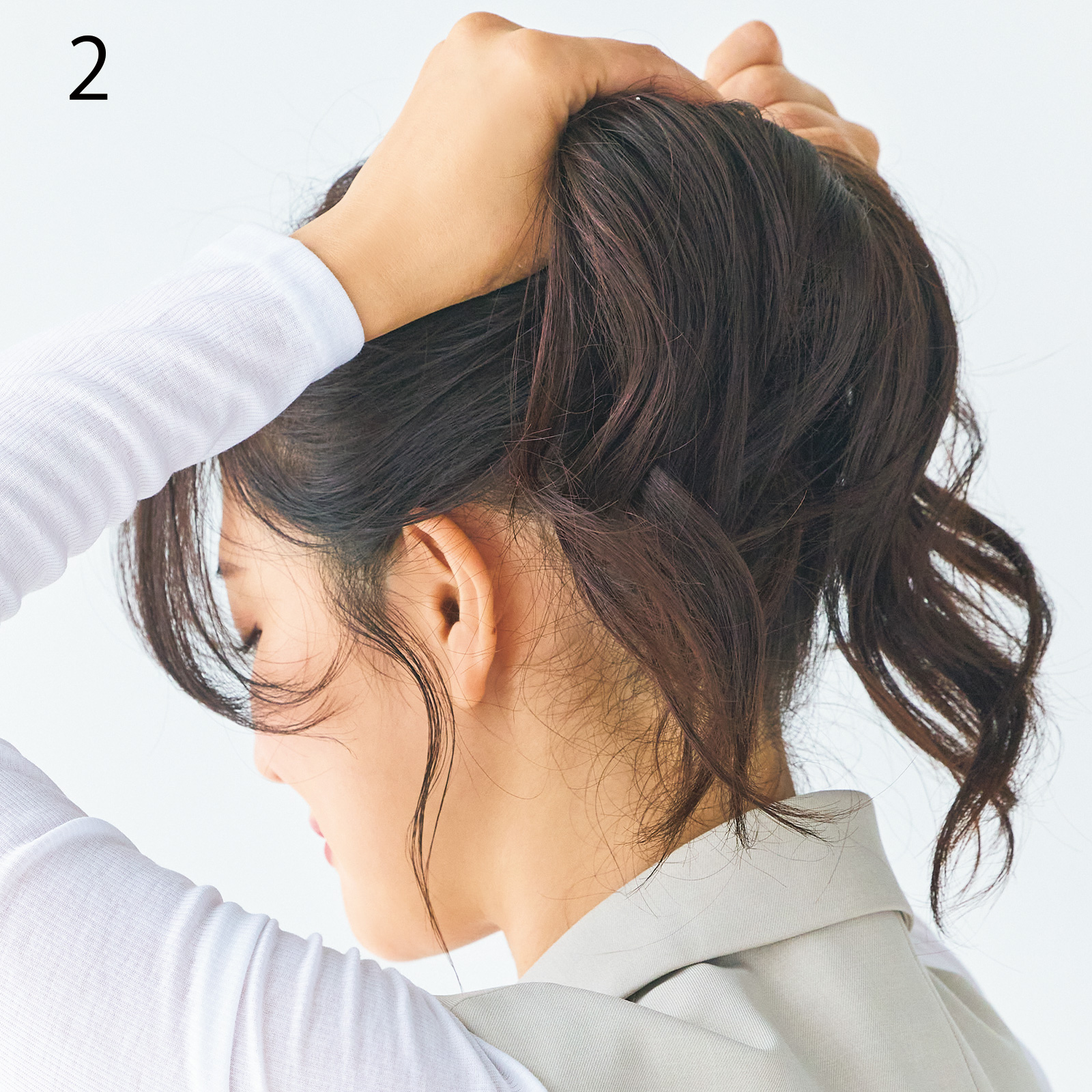 結んだ根元を両手でつかみ、軽く上に引き上げてから左右に広げます。根元が上向きになり、毛束全体がふんわりします。