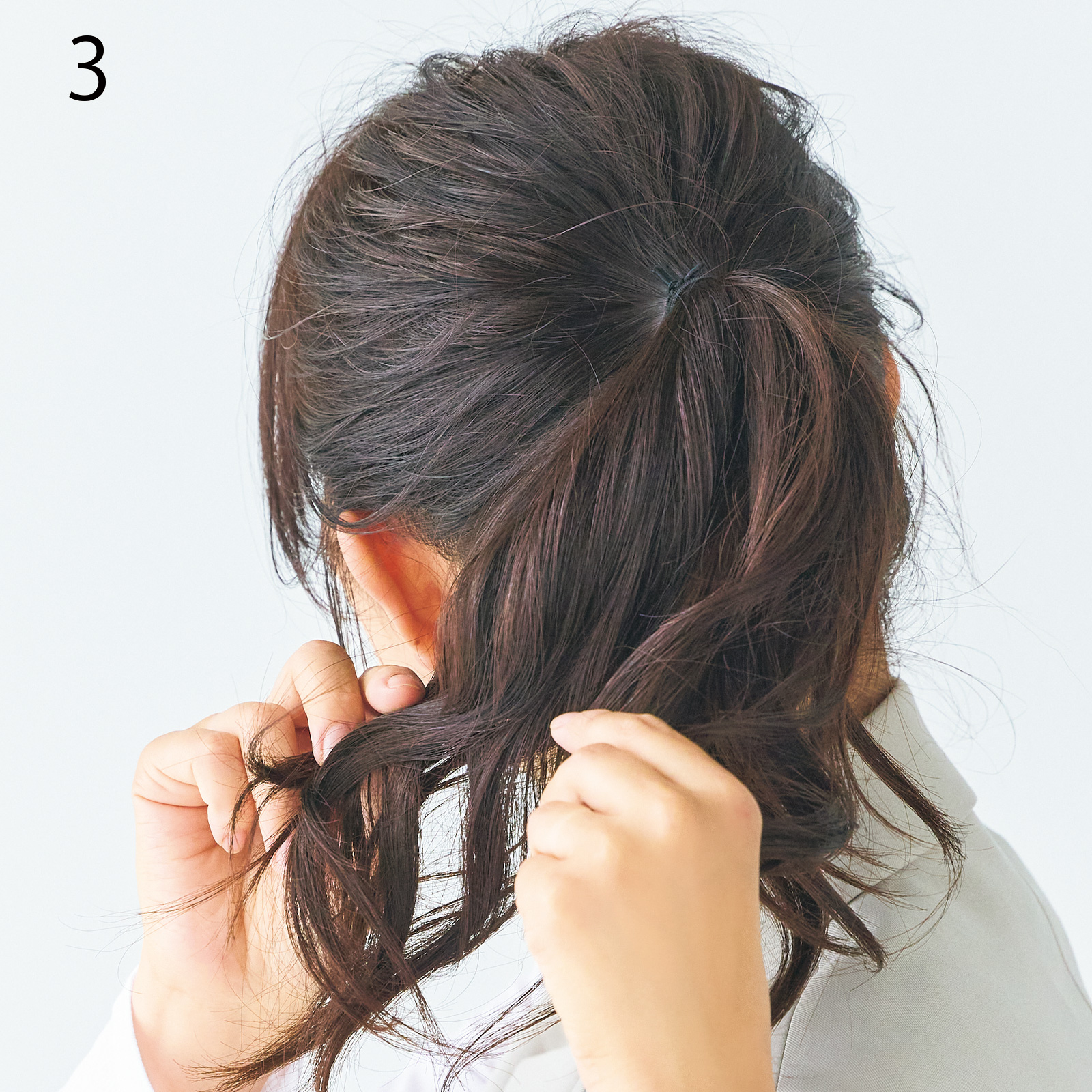 もみあげの髪を一束下ろします。手ぐしを使って耳上くらいの高さで1つにまとめ、ゴムでしっかりと結びます。