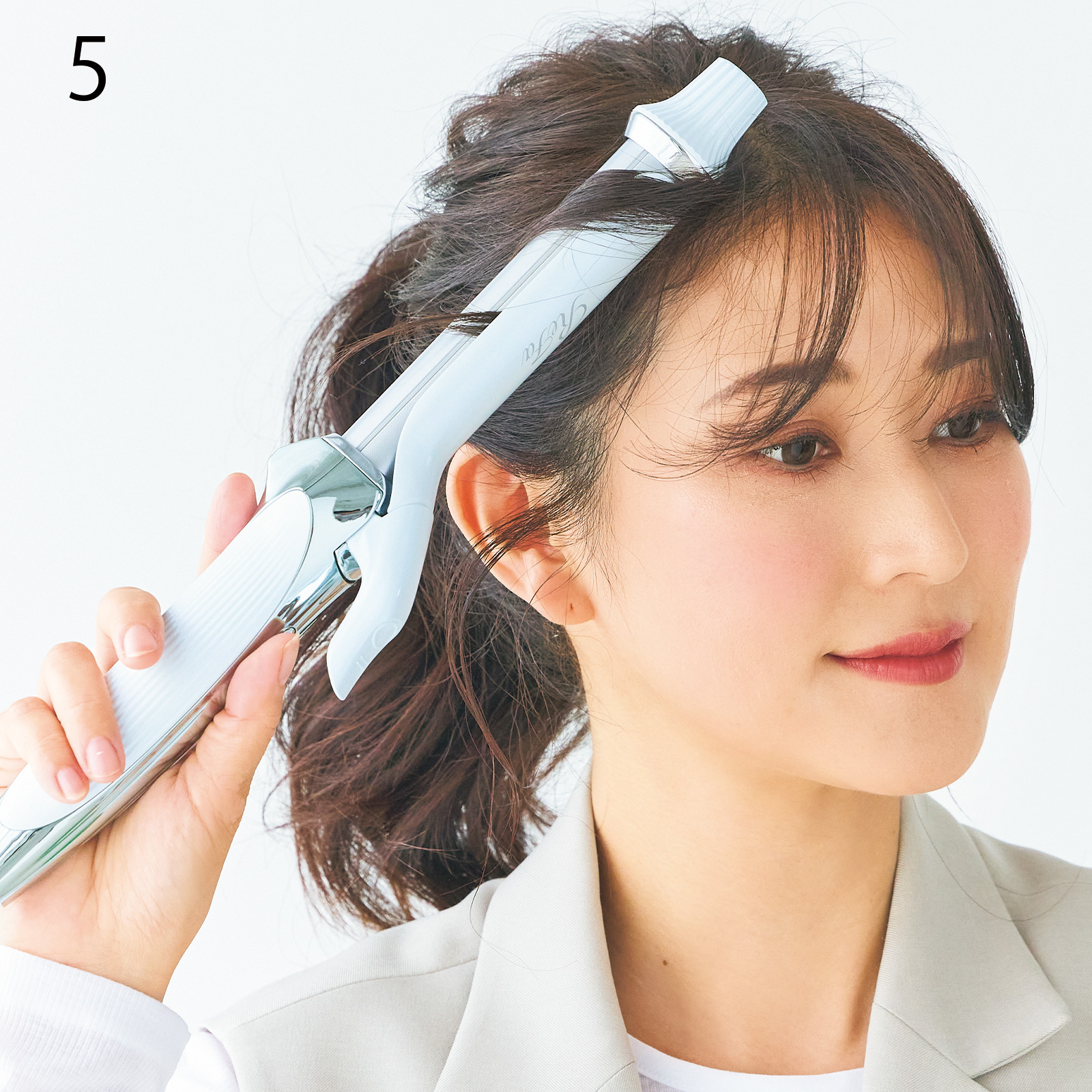 カールアイロンで前髪を大きく内巻きにします。サイドバングは根元を潰しながらアイロンを斜めに使ってリバースに。