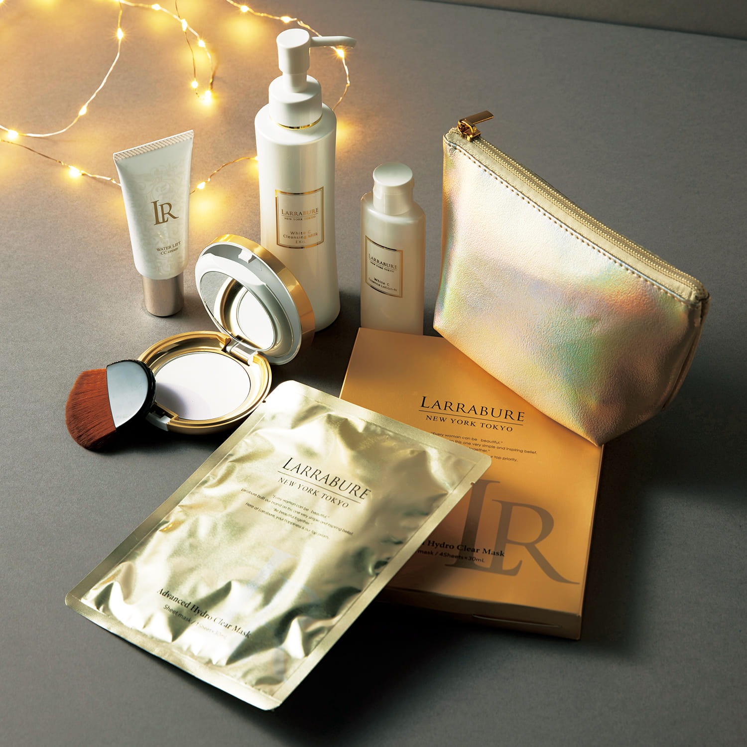 CCクリームをはじめ、ツヤと潤いを与えるUVパウダー、肌疲れをリセットするクリアマスクが現品で。エッセンスローション、クレンジングミルクといったお馴染みの名品もミニサイズでイン。 X’masコフレ ¥13,200(ララビュウ)