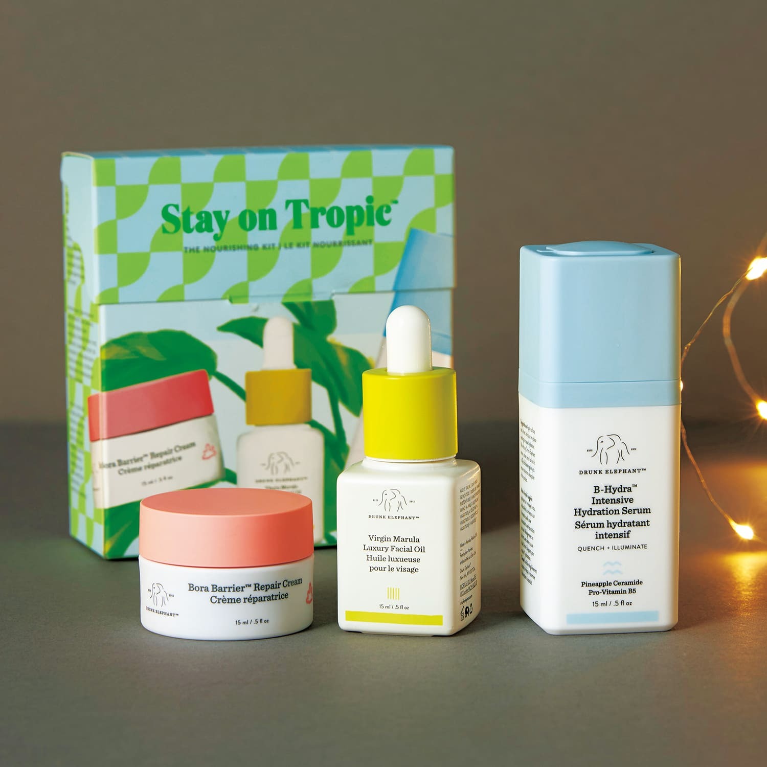 潤い補給に特化した保湿液、みずみずしいツヤを与えるオイル、リッチなコクで肌を包む9月発売の保湿クリームがトラベルサイズでイン。旅先でも健やかな肌をキープ。ステイ オン トロピック ナリシングキット ¥7,810(ドランク エレファント)