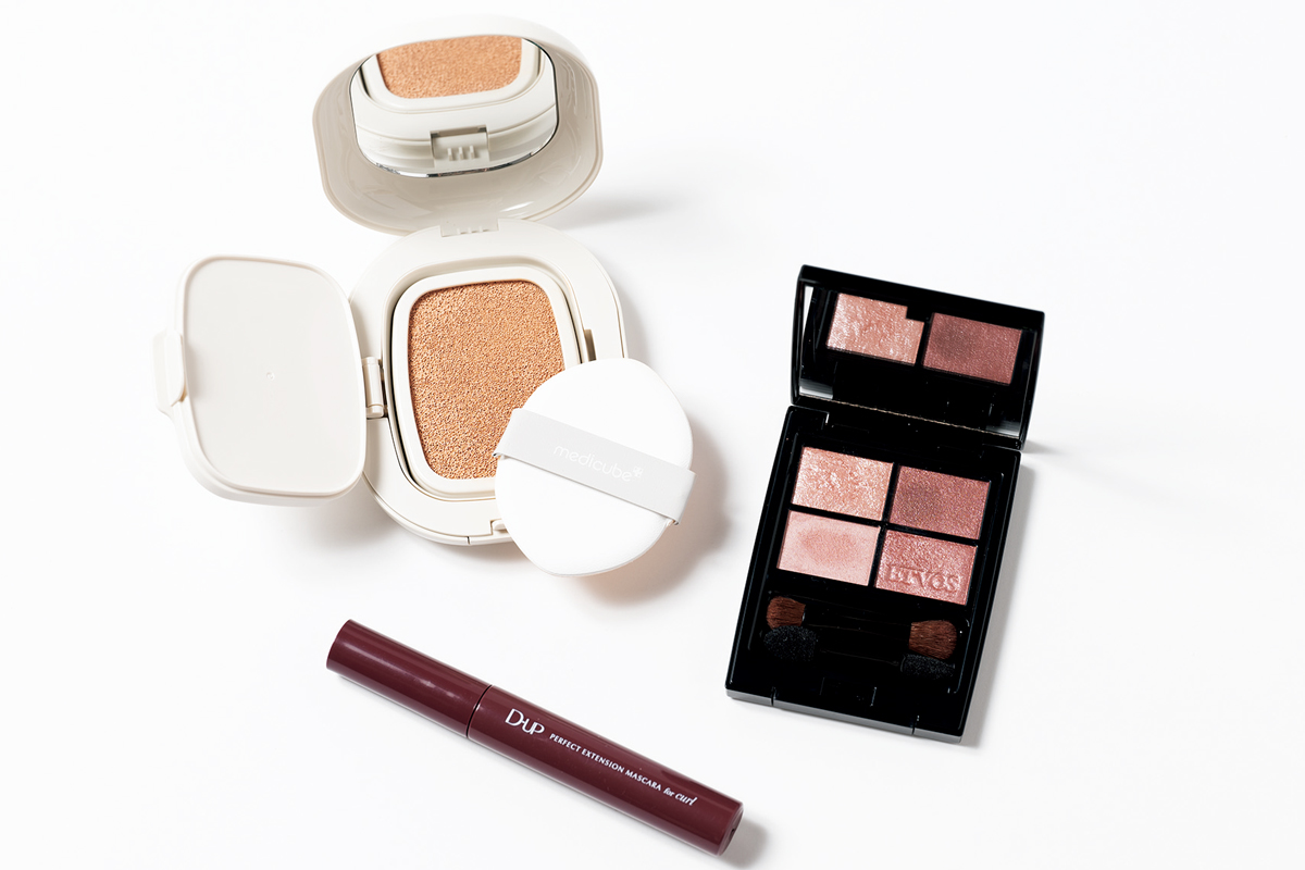 メディキューブのプログルタチオンファンデベルベットは毛穴カバー&トーンアップ効果抜群。ETVOS のミネラルクラッシィシャドー(フレンチフィグ)でブラウンベースの上品な瞼に。D-UPのシルキーリキッドアイライナー(ピーチモカ)で目元の印象を柔らかく。