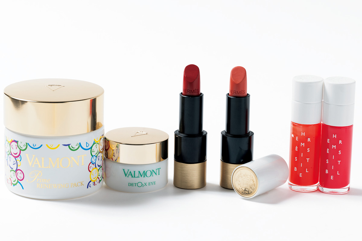 実はエルメスのリップマニア♡中央のルージュア レーヴル サティネ 16、75は夫からのプレゼント。右側のリップオイル01、03を重ねるとさらに華やかな印象に。ヴァルモンのクリーム&アイクリームは、睡眠不足のときに投入すると即、肌と目元が生き返る救世主コスメです。