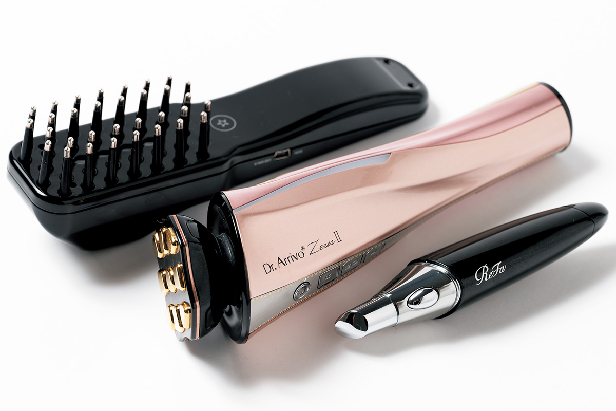 美顔器には惜しみなく投資。エレクトロンのデンキバリブラシは、朝起きて顔に元気がないときやメイク前に使用。中央のDr.Arrivo Zeus Ⅱはフィット感が絶妙で出番多め。リファ ビューテックポイントは目元&口元用美顔器。毎晩使用し、年齢が出やすい目元ケアを徹底しています。