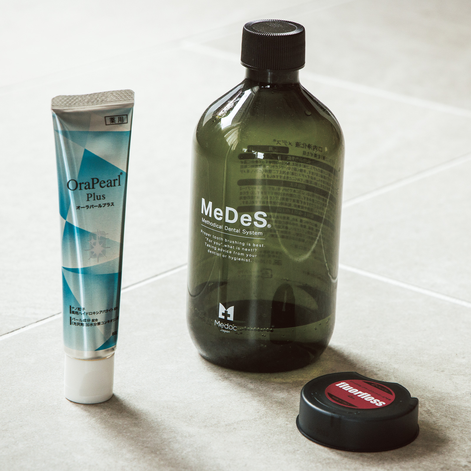デンタルケアこそ性別がないからいちばんシェアしやすいアイテム。歯科医院で購入したメデスのマウスウォッシュは1日3回、歯磨きの後はフロスでケアが夫婦の習慣。