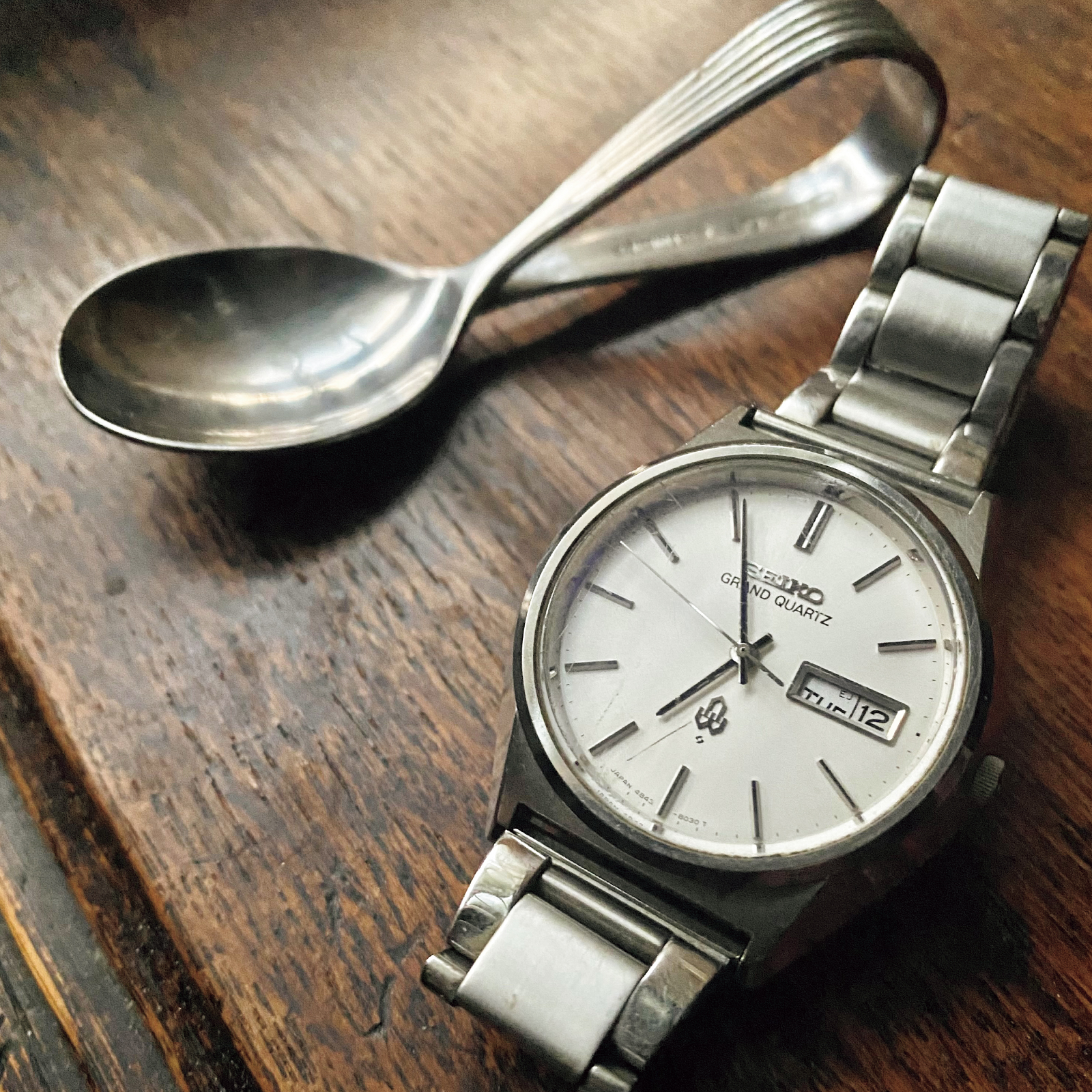 セイコーのクオーツ式腕時計は亡き父の愛用品。銀のスプーンは、私と夫(従弟)が使った離乳食用。父が亡くなった翌年天に召された愛猫もみじもこれで缶詰を食べました。