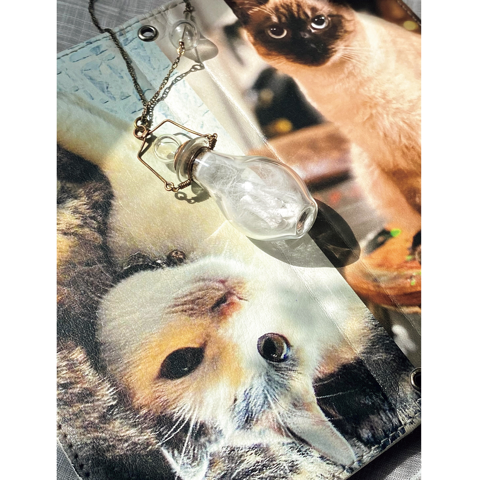 愛猫もみじの毛や骨を納めたペンダントを、ここぞというときのお守りに。もみじ&お絹の写真で作ったスマホケースは何度も作り替えています。写真なら1万枚はあるので。