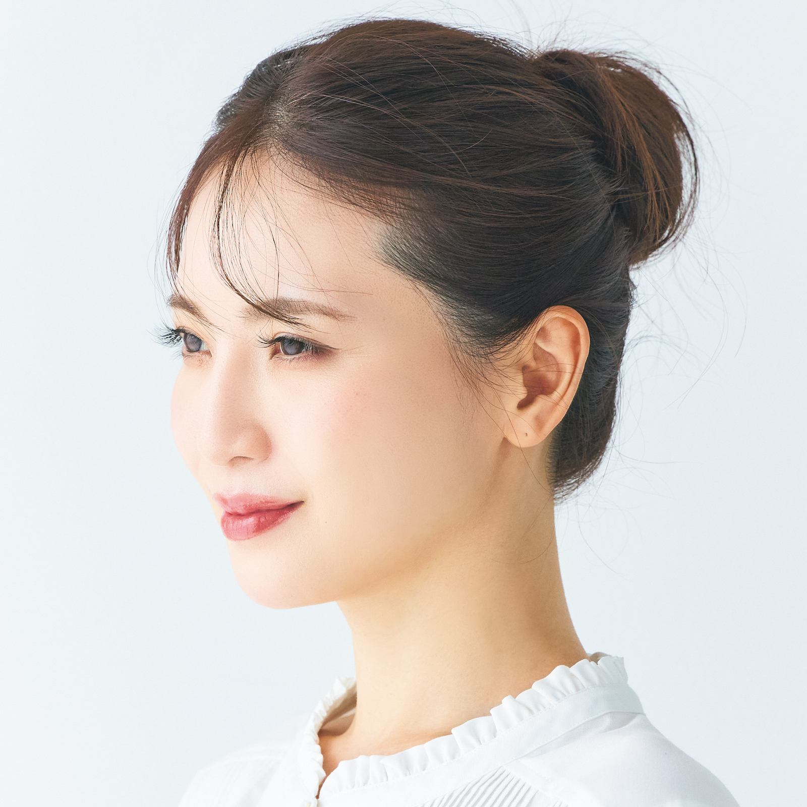 キュッとまとめて面が出ると、表面にある白髪を目立たせる原因に。顔周りだけでなくシニヨン、衿足の白髪も目立っています。