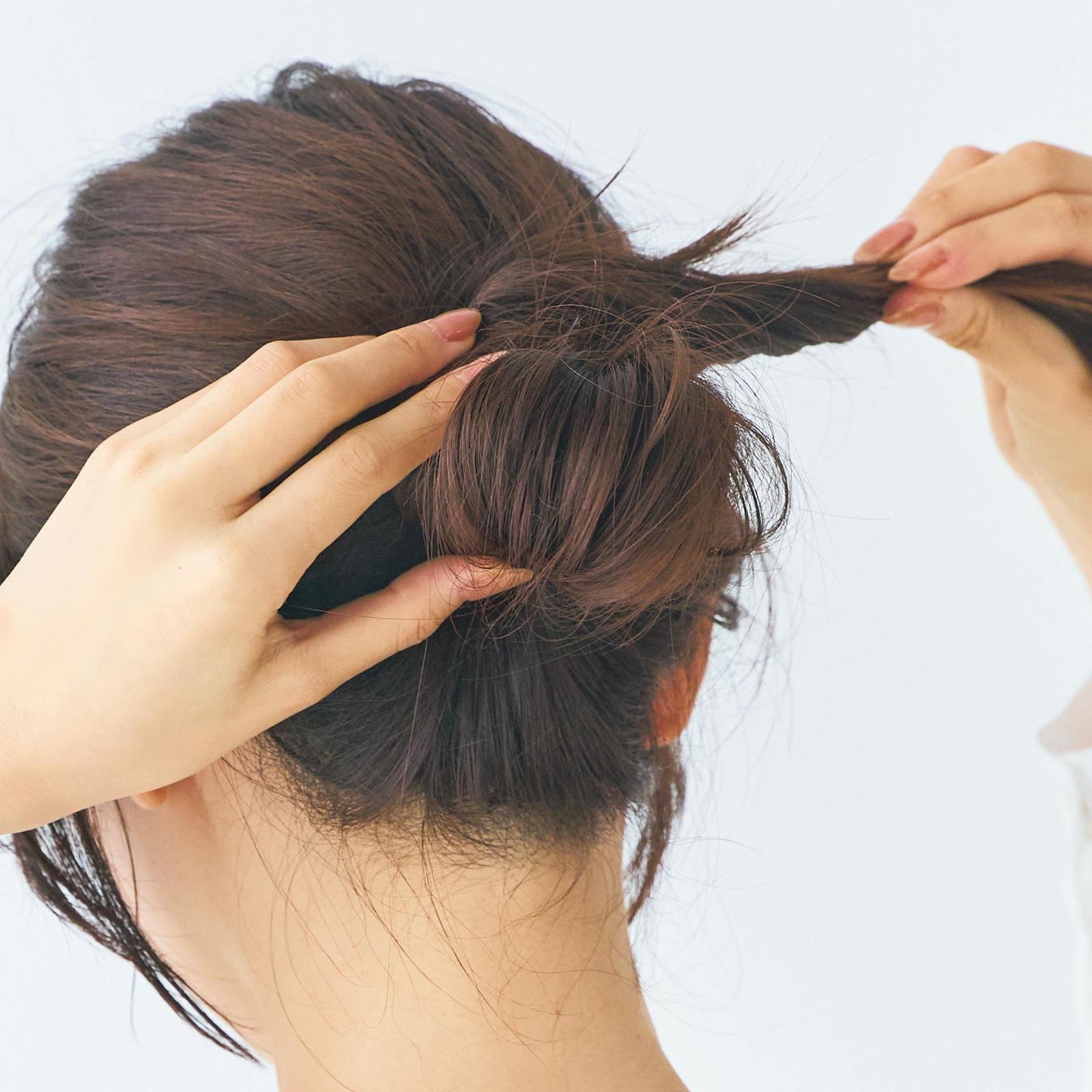 3.根元を手で押さえながら、トップやシニヨン、衿足などの髪を軽く引き出します。白髪がある部分の表面を凸凹にすることで、白髪が目立たなくなります。